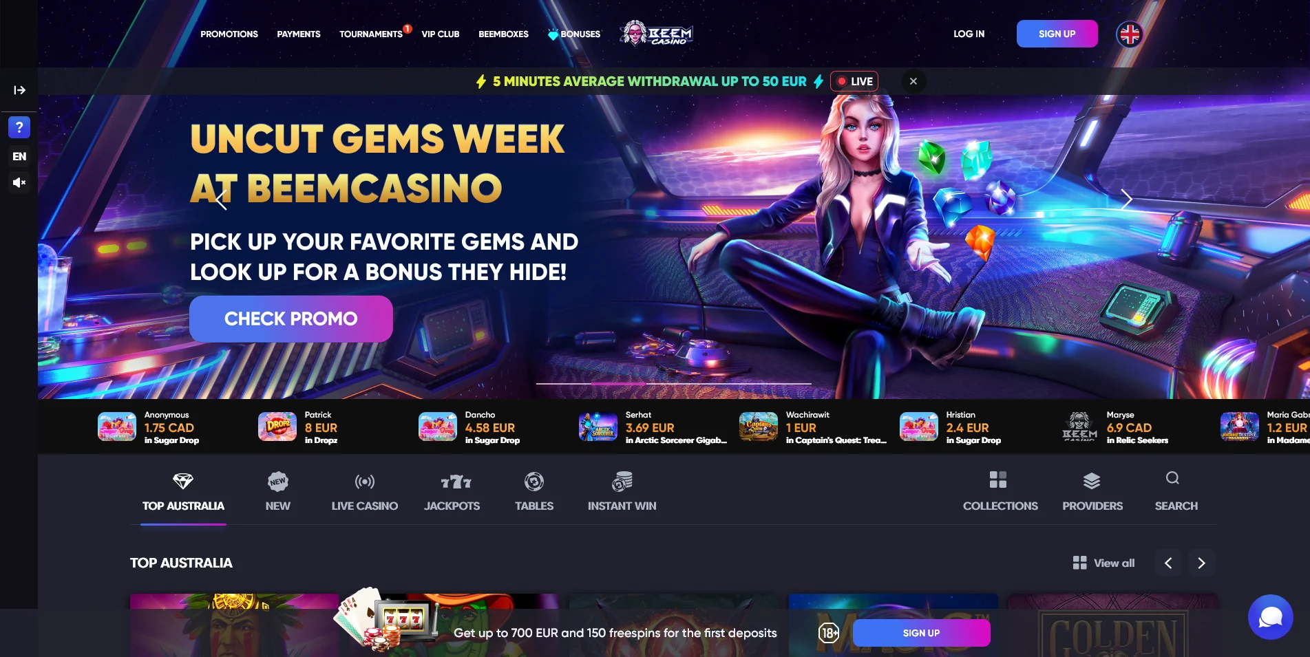 Moving on to the upper central part of the homepage, an enormous neon-coloured banner introduces some of the bonuses available in the promo list of Beem Casino. Aussie players can scroll through some weekend deals, the welcome package, as well as some games from selected software providers. Right below the banner, you can see a display of the ongoing games being played by players and how much they’ve won.