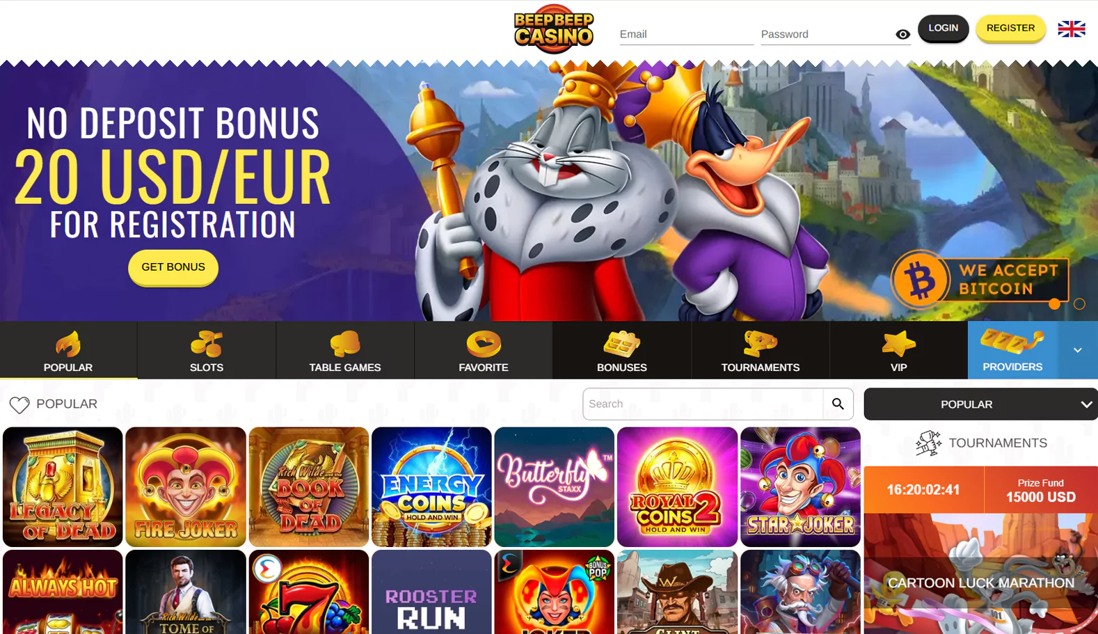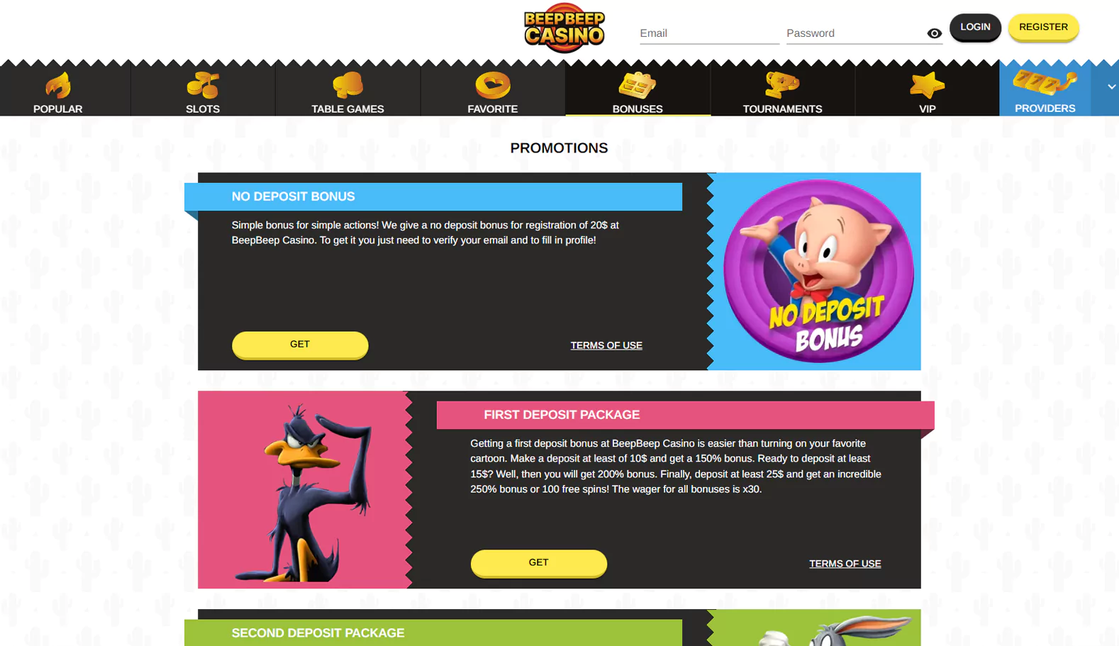 Beep Beep casino is designed in the beautiful style of the Lunay Tunes cartoon with its colorful characters. This definitely sets it apart from many other modern online casinos. Speaking about the interface, we can note its convenience: