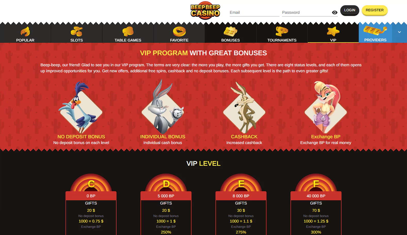 | Beep Beep casino VIP Level | BP requirement | Beep Beep Casino No Deposit Bonus | Exchange BP | Bonus for Deposit | Cashback | Birthday Bonus |
