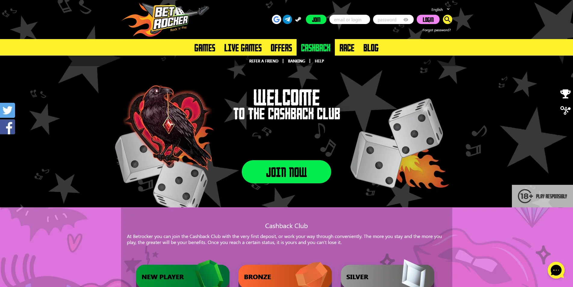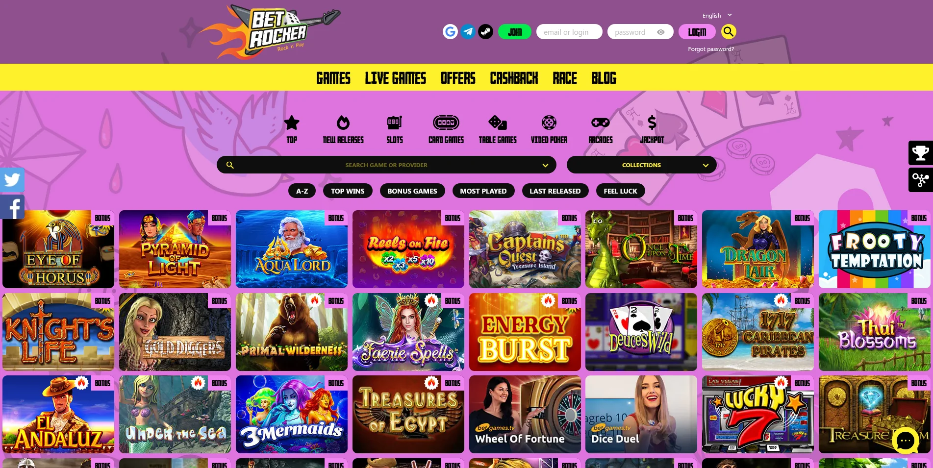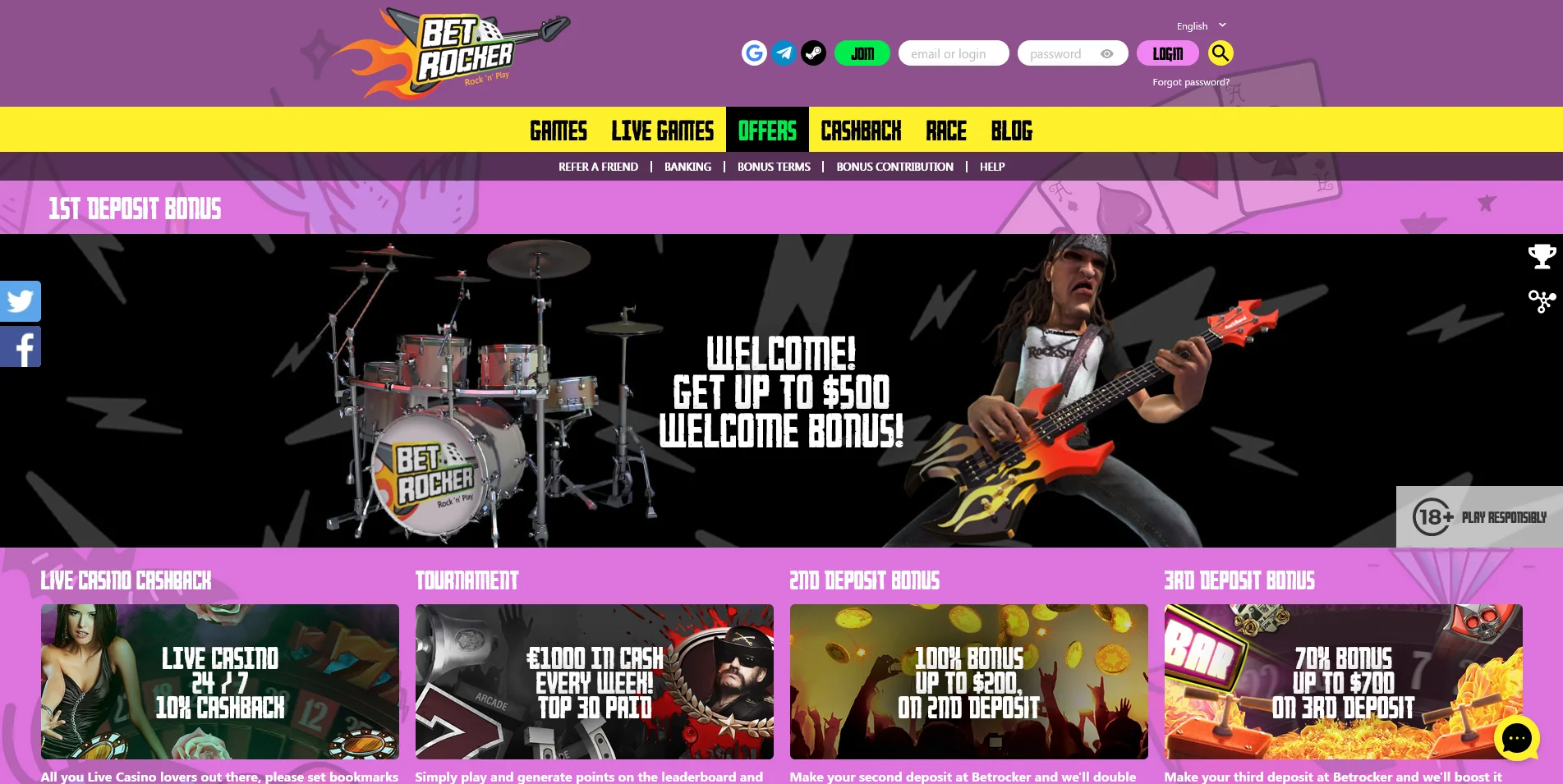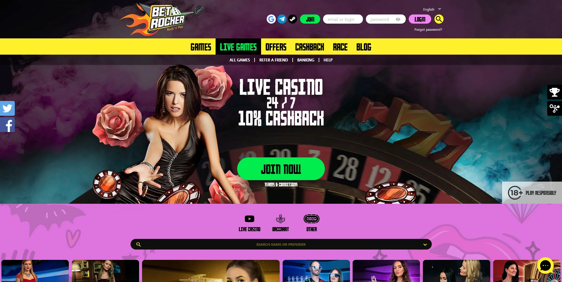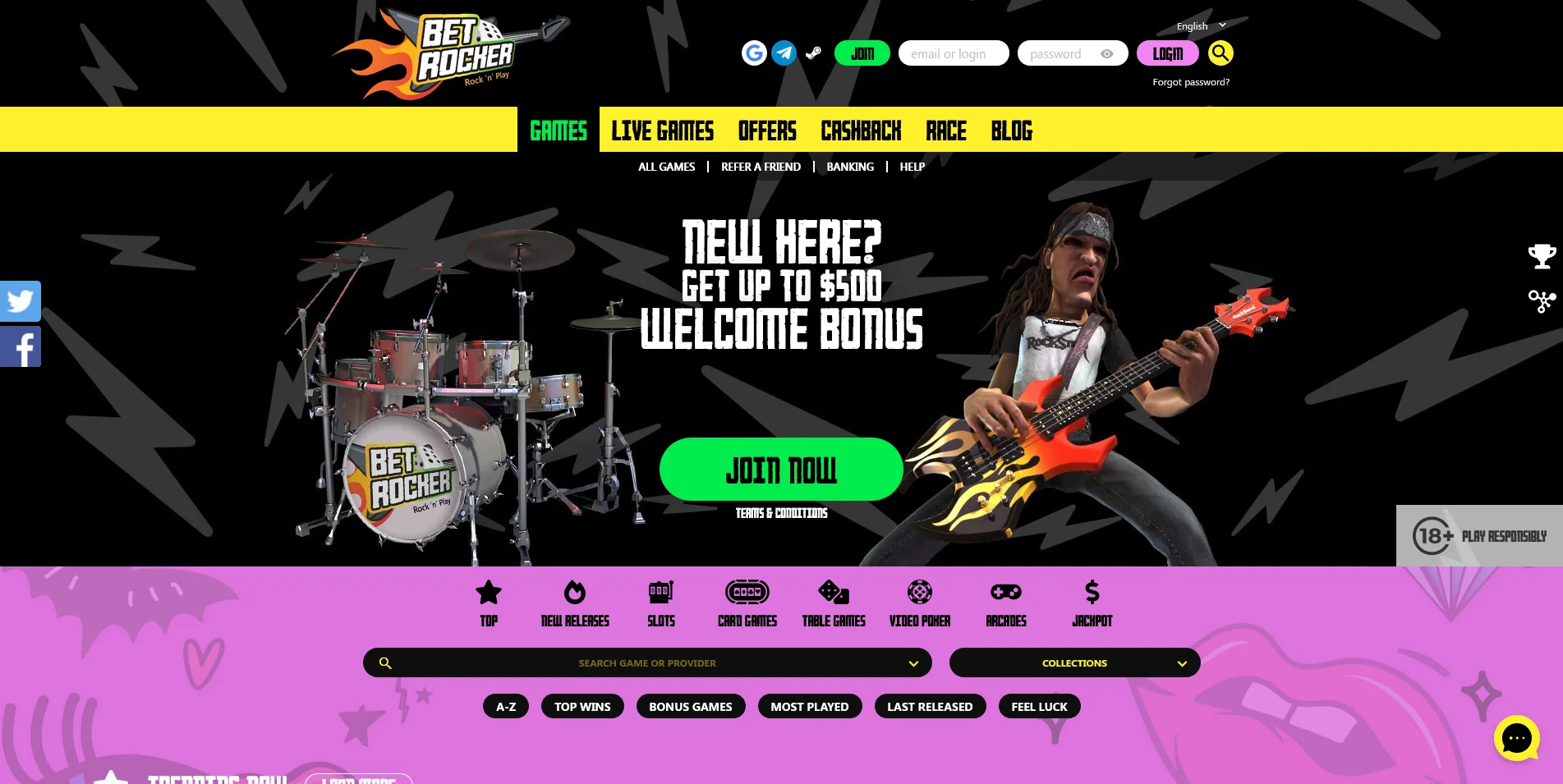 When creating this Betrocker Casino review, we were surprised to find a neat, simplistic homepage, introduced by the recognisable fiery guitar logo in the top left corner and the pink ‘Login’ button on the right.