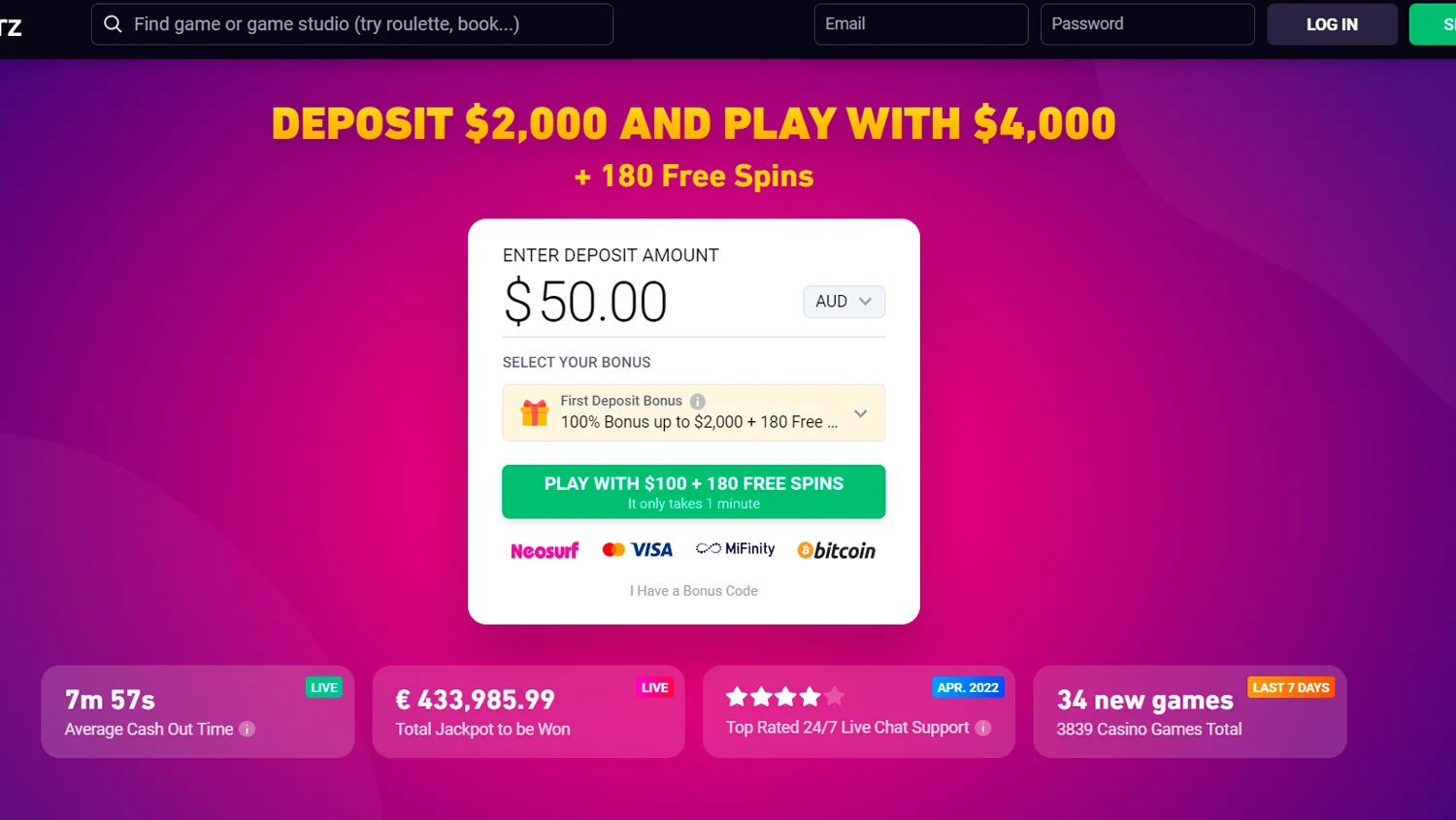 BitStarz casino is a dreamy place for Australian players to play their favorite games. There are over 1000 unique real money games for Aussie gamblers, and the bonuses get just as big – up to AU $2,000 on your very first deposit.