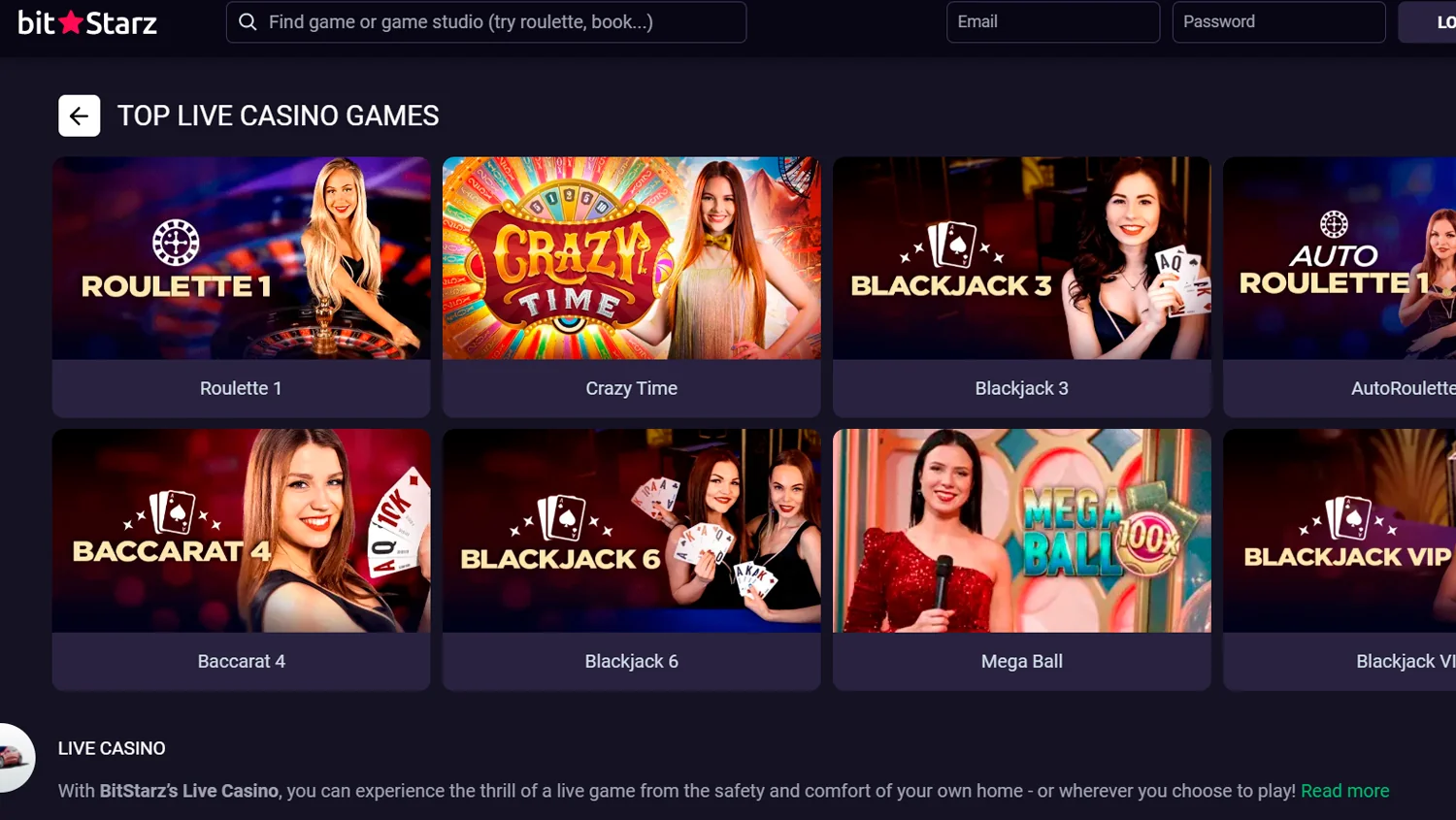 The BitStarz Live Casino offers the experience of gambling for real while still basking in the safety and comfort of your own home. To visit it, click on ‘Live Casino’ at the top of the list of casino games.
