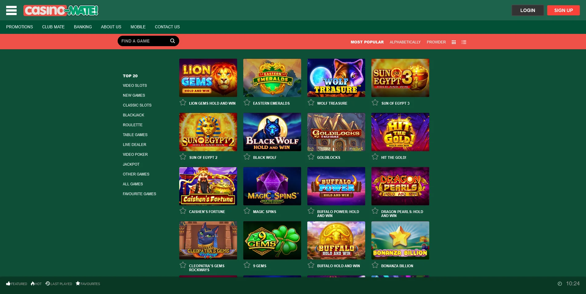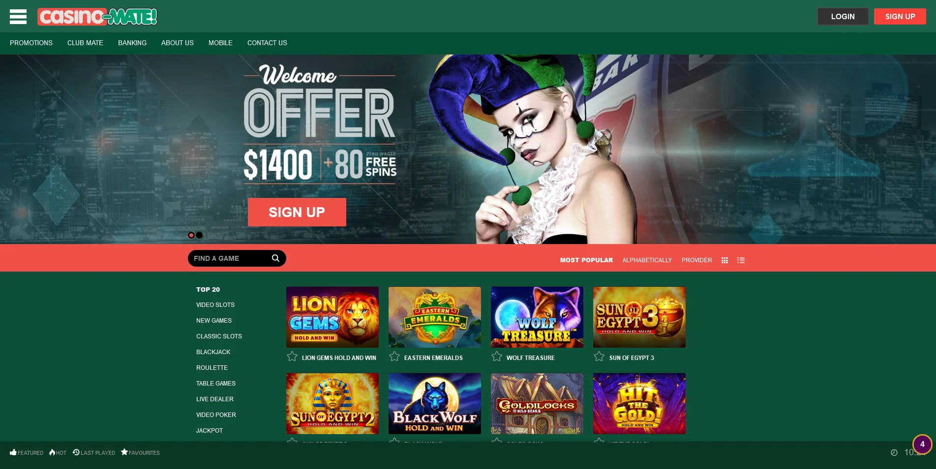 The real money CasinoMate home page shows off the bonuses and promotional banners at the top. This is followed up by a grid filled with the latest and most popular games. You can filter out the Top 20, Video Slots, Blackjack, Roulette, etc. Basically, different classes of games. They can then be sorted in order of popularity, alphabetical order of name, or by a provider.