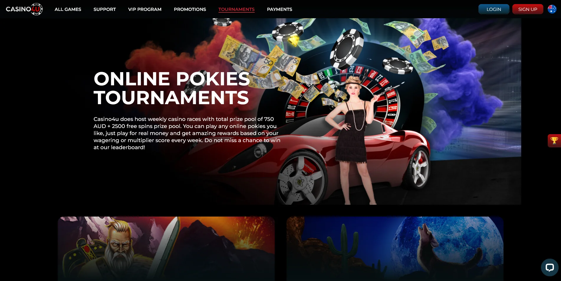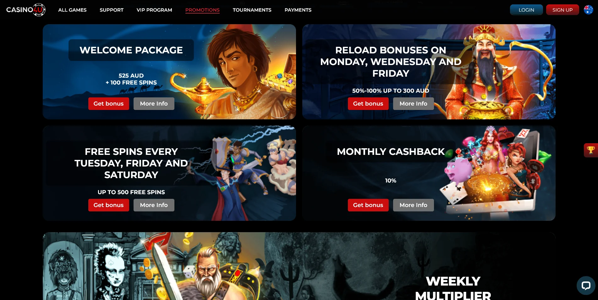 It’s all quite simple and straightforward. When entering the Casino4u main page, the sign-up bonus and the most important bonuses are right in front of us. In the top right corner, there are three important buttons: