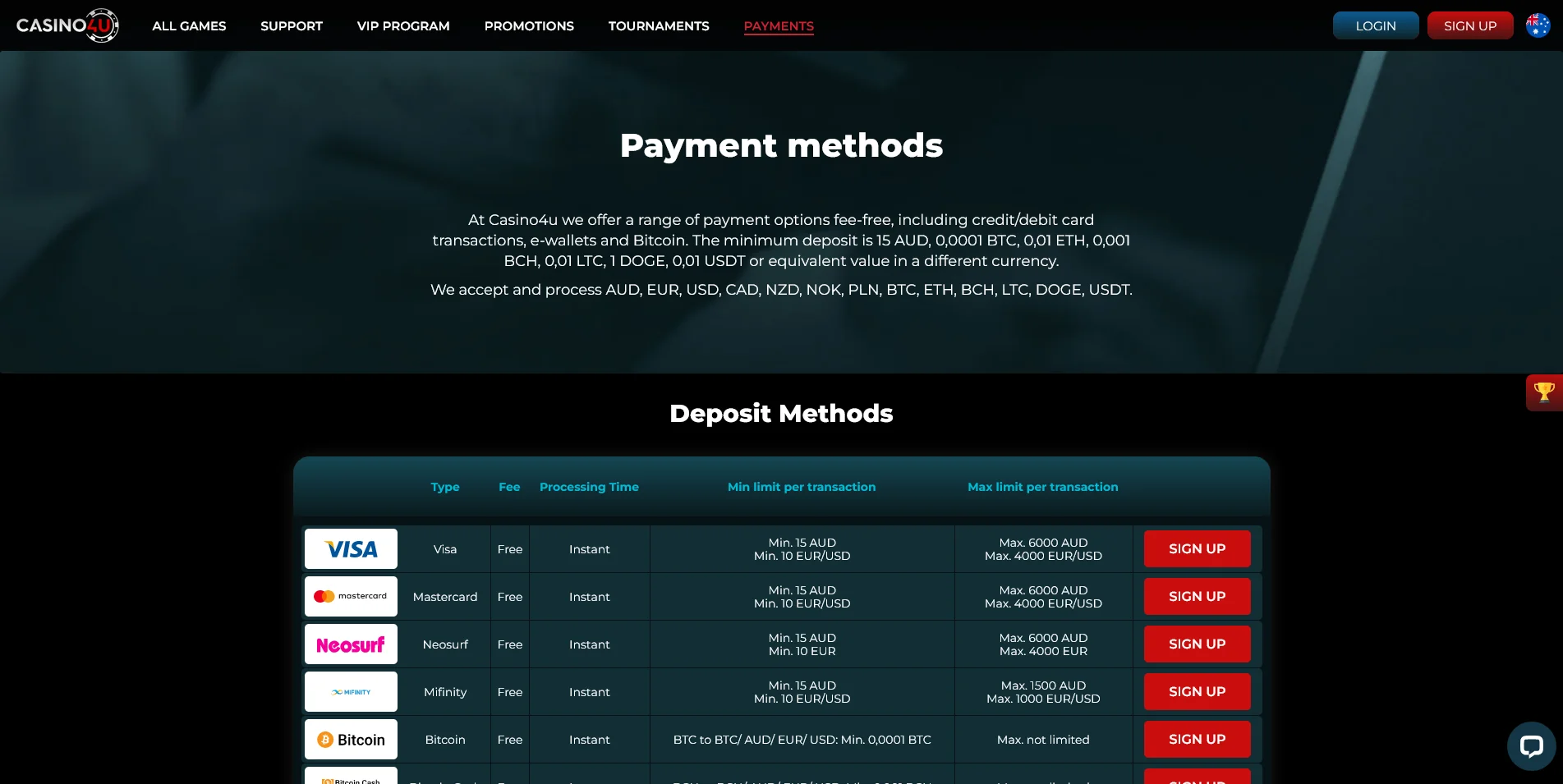 Min. withdrawal: 15 AUD