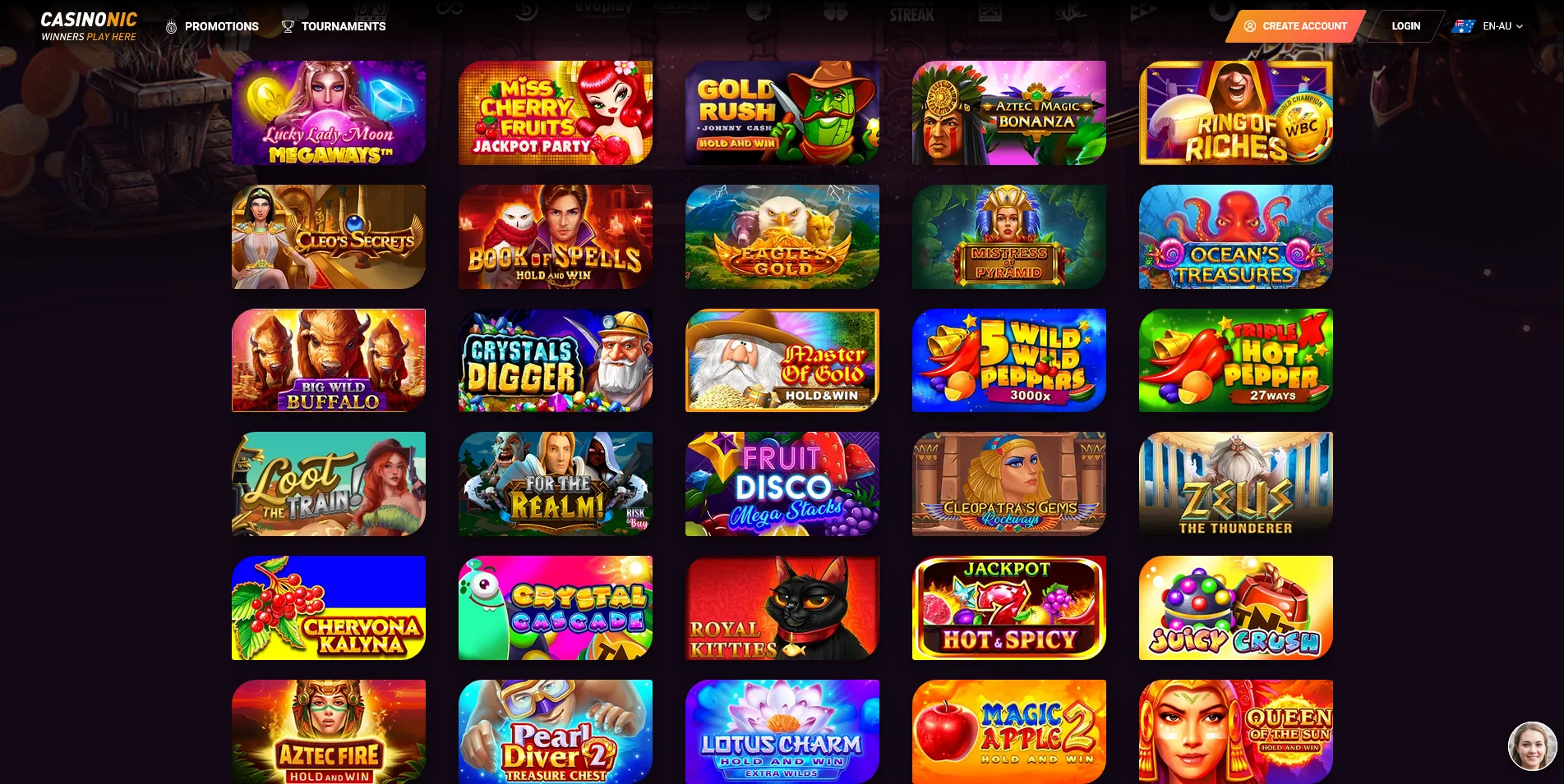 Right below is the big promo banner that shares info on the semi-tiered welcome bonus at Casinonic Casino and also some tournament prize pools. In the middle of the banner, there is another orange ‘Create Account’ button.