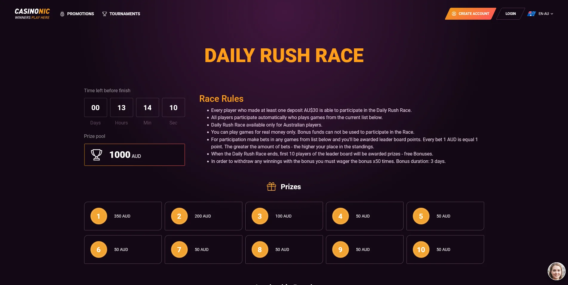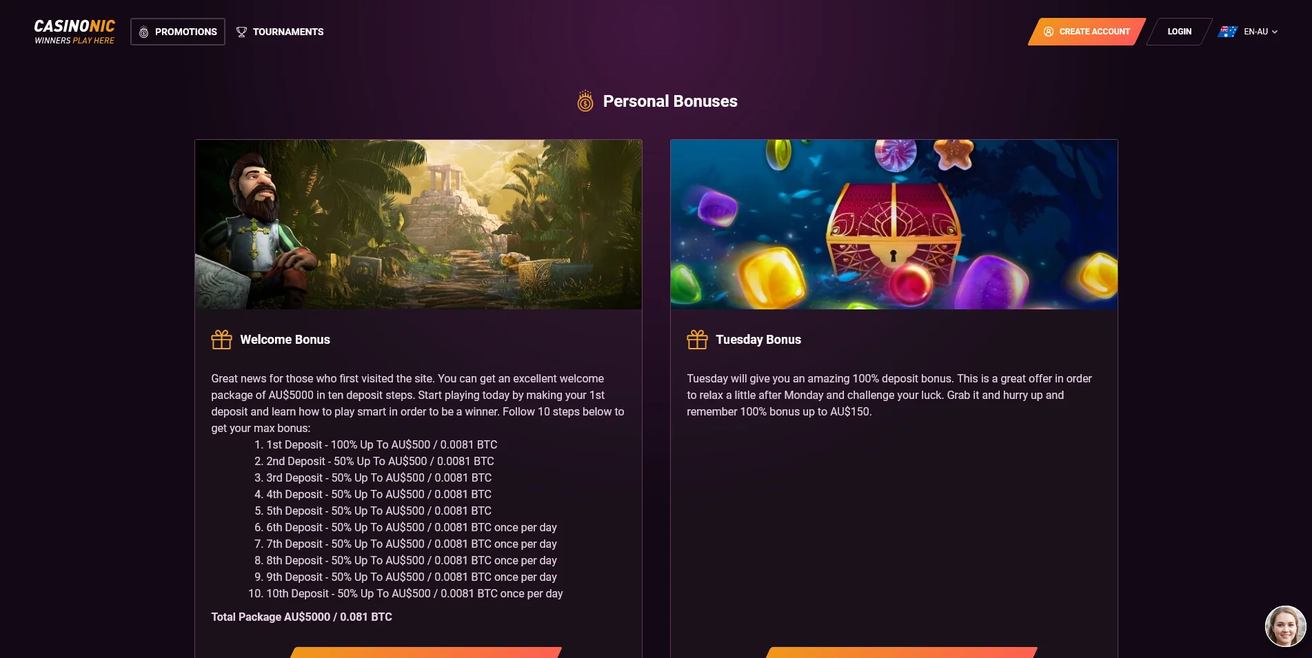 We believe that the variety Casinonic offers in terms of bonuses is average, however, the welcome package at Casinonic is the one that deserves an honorable mention because it rewards Aussies upon their first 10 deposits.