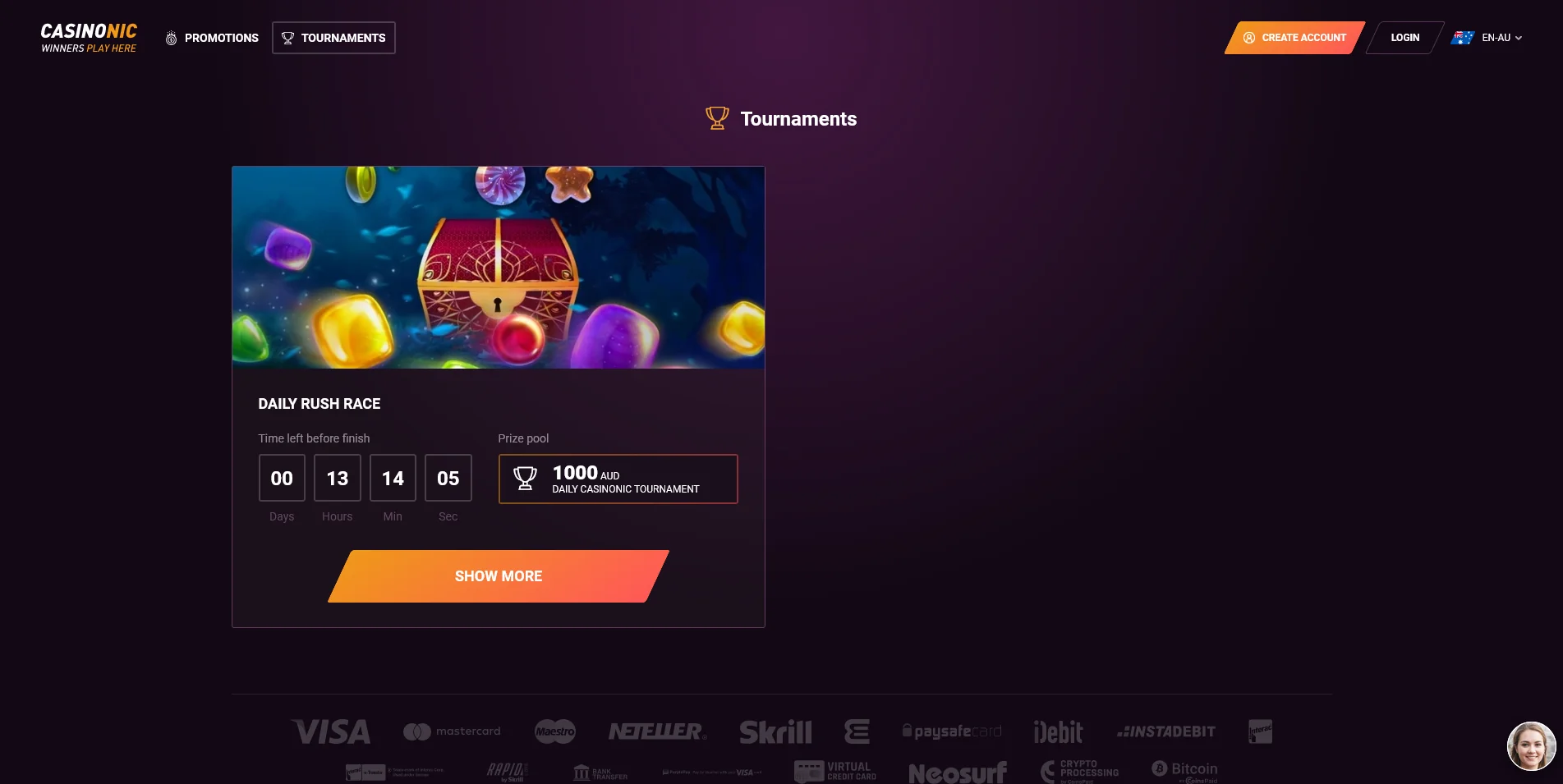 There is a decent variety of payment alternatives at Casinonic. Gamblers from Australia can select to deposit and withdraw via credit and debit cards, e-wallets, and also Bitcoin.