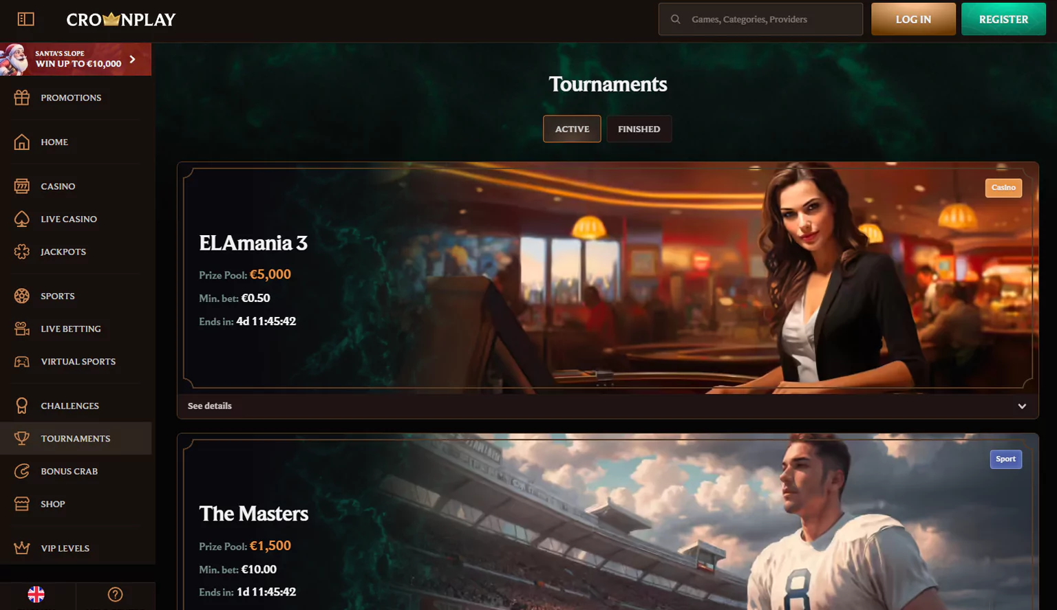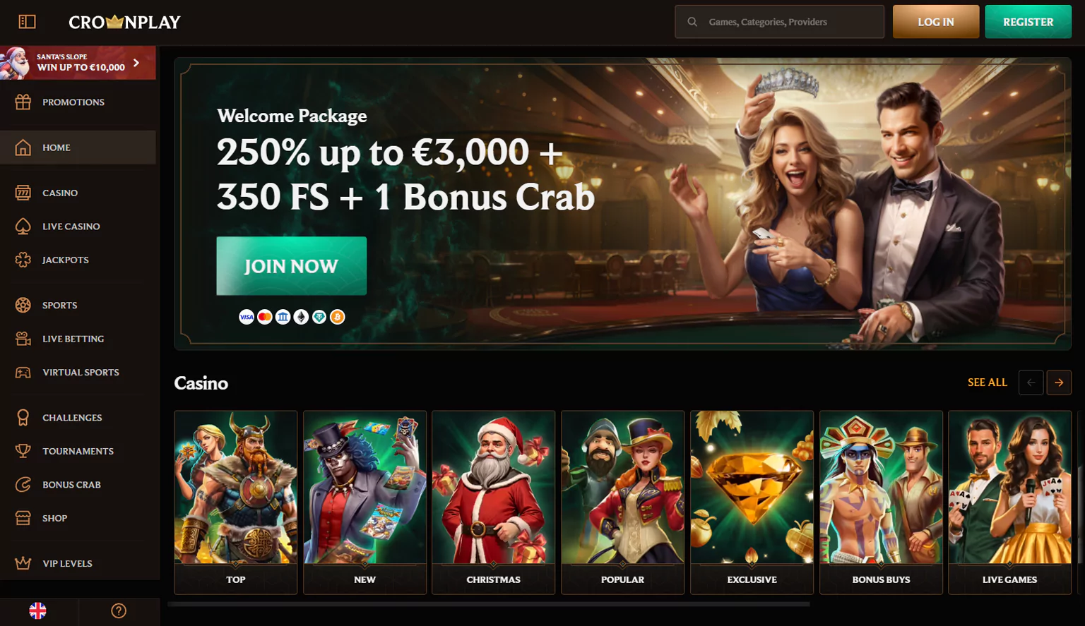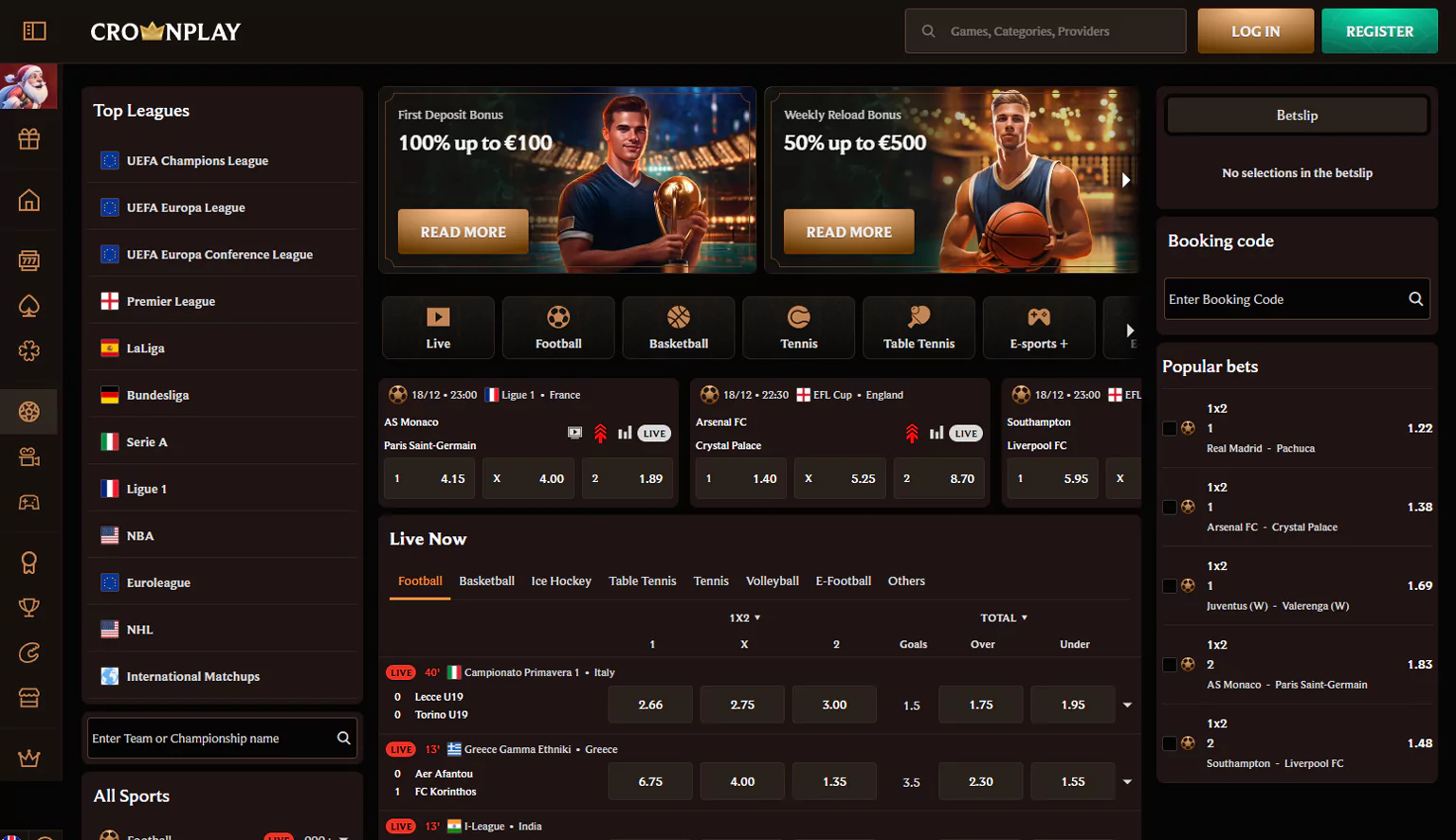 Crown Play Casino features a sleek and modern design with a colour palette that blends brown and golden accents, giving the site a classy and premium feel. The overall layout is clean and uncluttered, making it easy for beginners and experienced players alike to navigate the tabs.