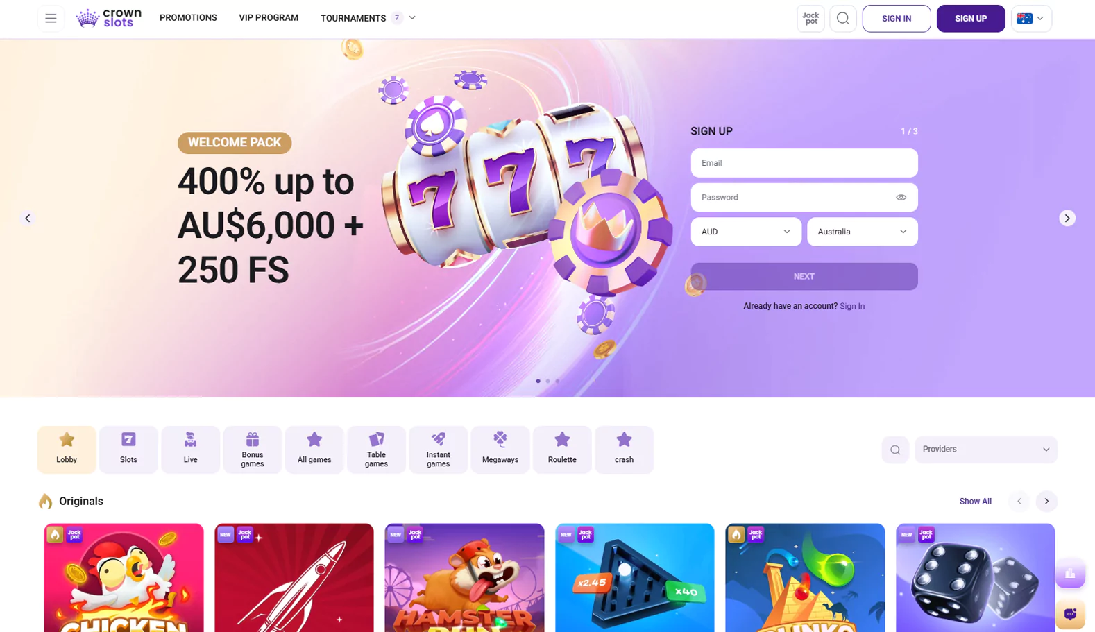 CrownSlots is a brand new online casino that offers users from Australia a full range of options to comfortably play Slots, Live games, Table games, TV games for real money. Thousands of games from dozens of famous licensed developers, easy payments, high security and honesty are waiting for you here.