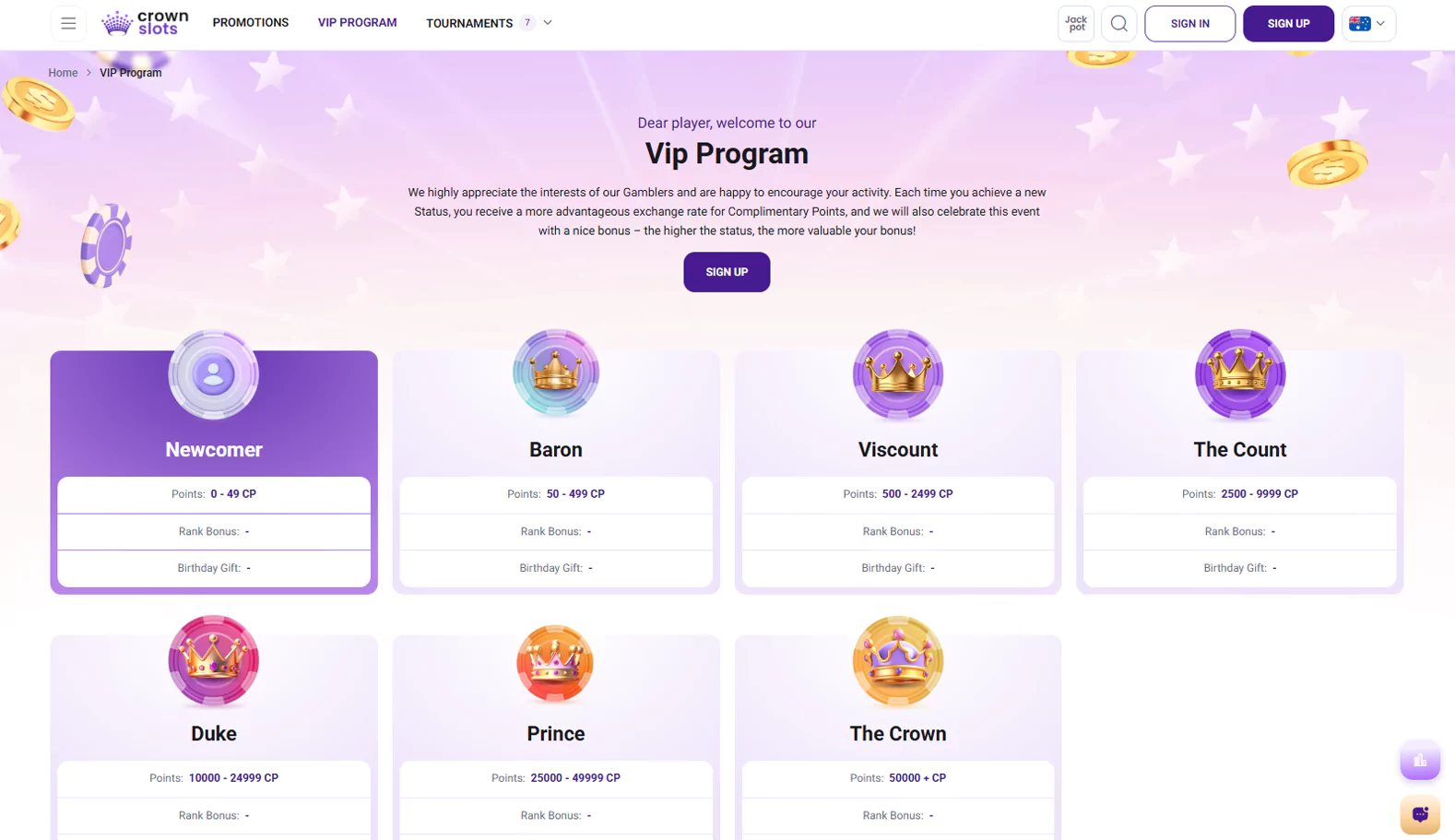 CrownSlots Casino has a multi-tiered loyalty program. that rewards players for continued activity and engagement. Players earn comp points (CP) by betting real money and progress through the seven tiers of the program. Each level offers increasing benefits such as exclusive bonuses, cashback, free spins and access to a personalized VIP manager.