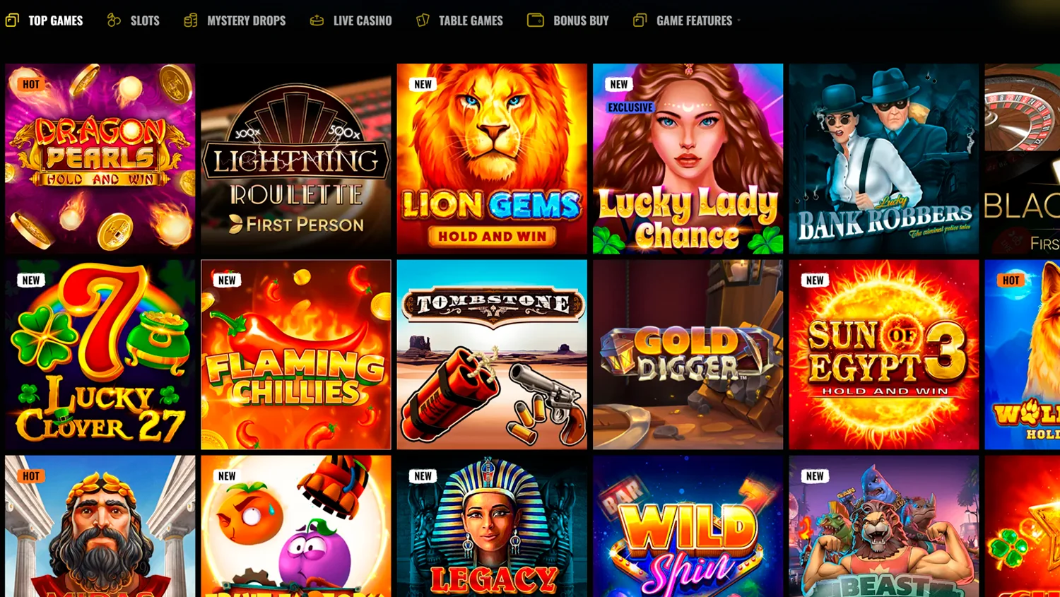 Top Games, Slots, Mystery Drops, Live Casino, Table Games, Bonus Buy, Jackpots, New, Megaways, Scratch, BTC Games, Classic Slots.