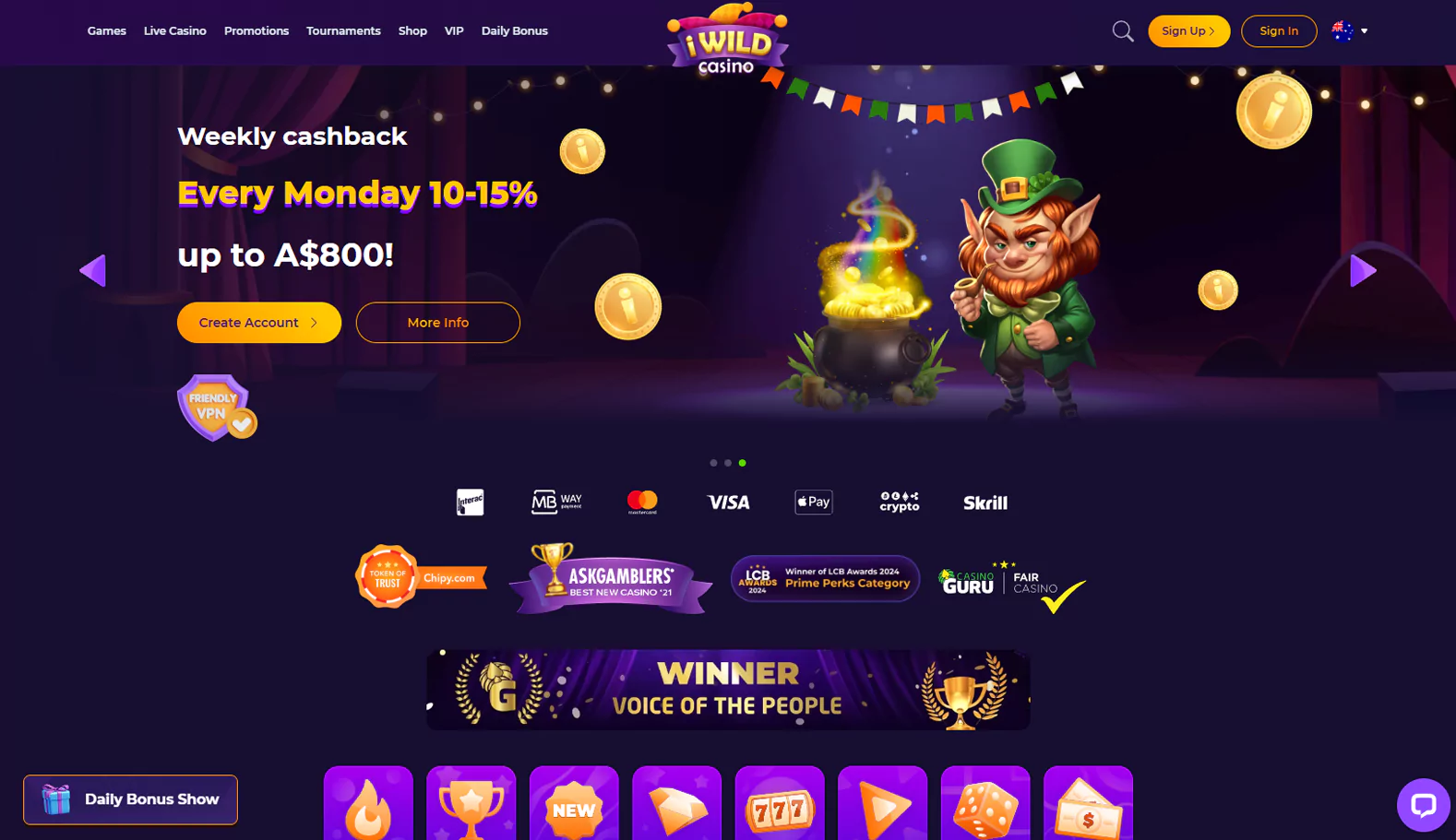 During our iWild casino review, we visited all the main sections and can conclude that the navigation at iWild is very user-friendly. Here are the main details: