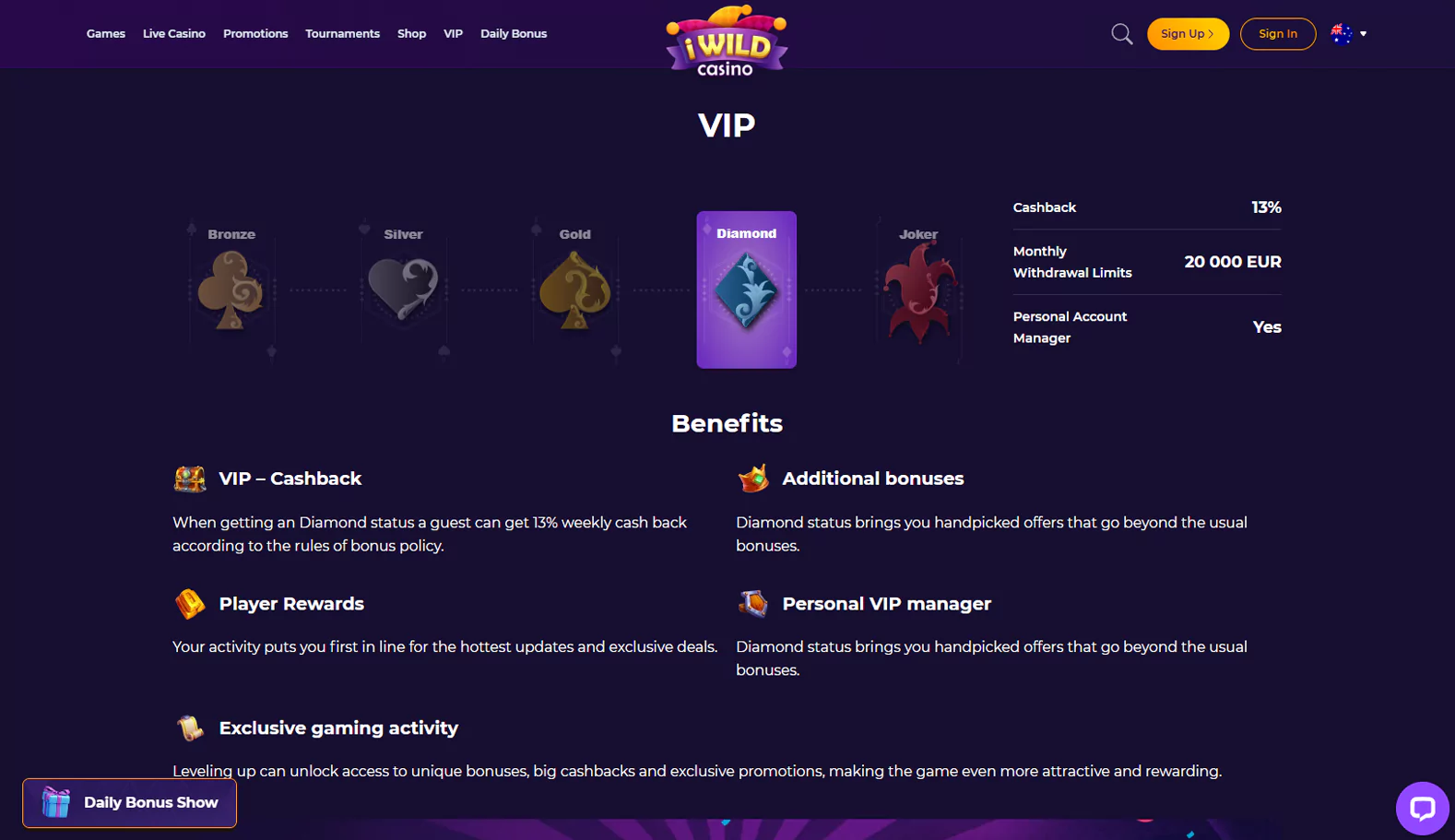 | VIP Level | Cashback | Monthly Withdrawal Limit, AUD | Personal Manager | Main Features |