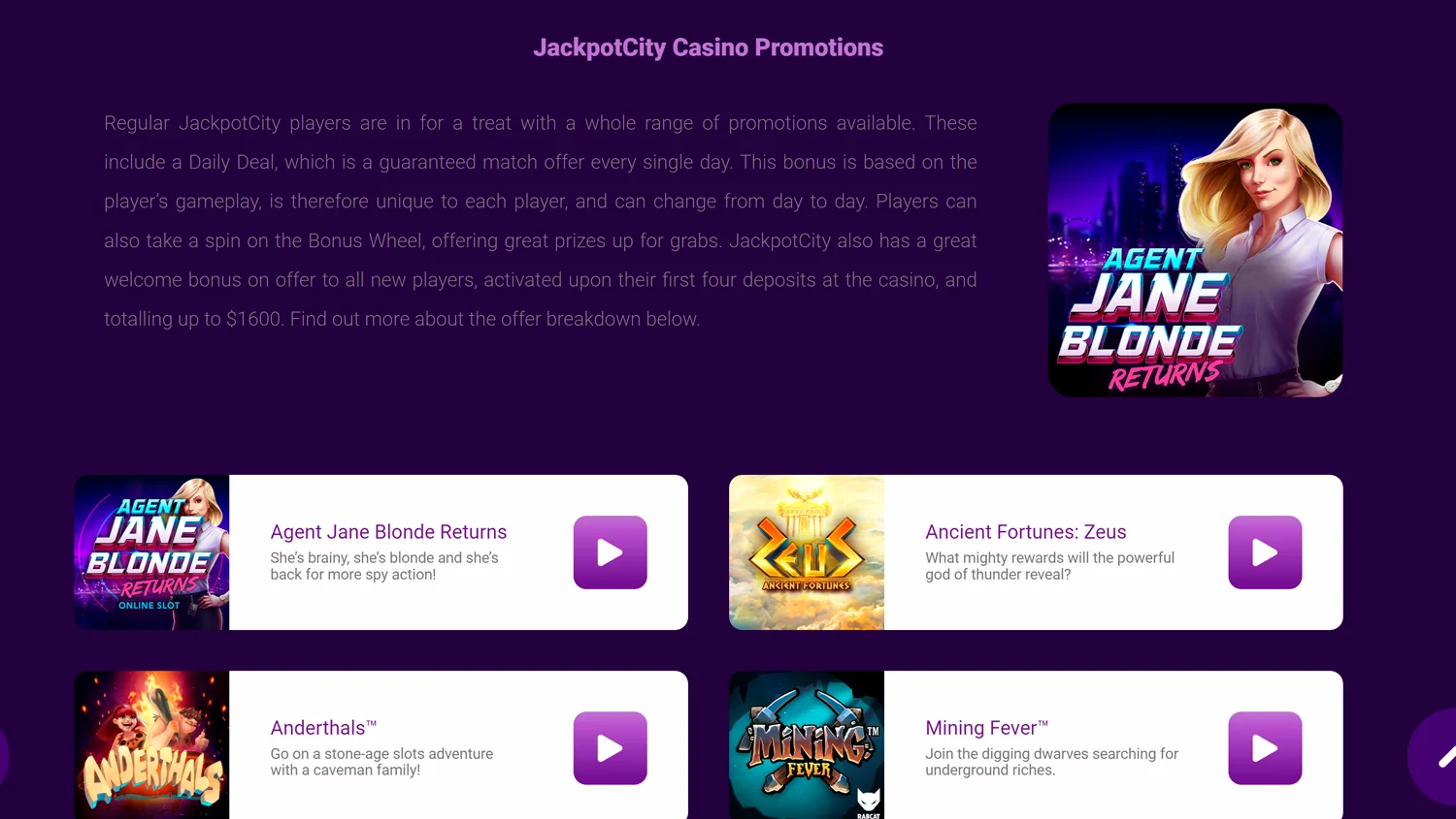 We also analyzed the gifts offered by this provider. JackpotCity has prepared generous bonuses for registered users: 400% welcome bonus for new users up to A$1600.