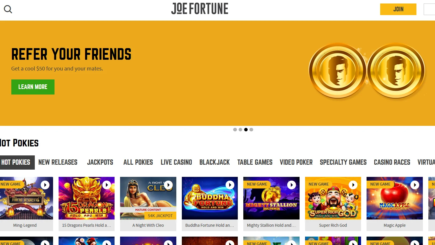 The site is regulated in Curacao. This means gamblers are protected by an independent regulatory body. All personal data on the site is secured by 128-bit SSL encryption. Apart from gambling, there’s a decent referral program allowing you to profit even more by inviting friends to Joe Fortune casino. Keep reading about this online casino in Australia and see Joe Fortune Casino pros and cons that we checked out.