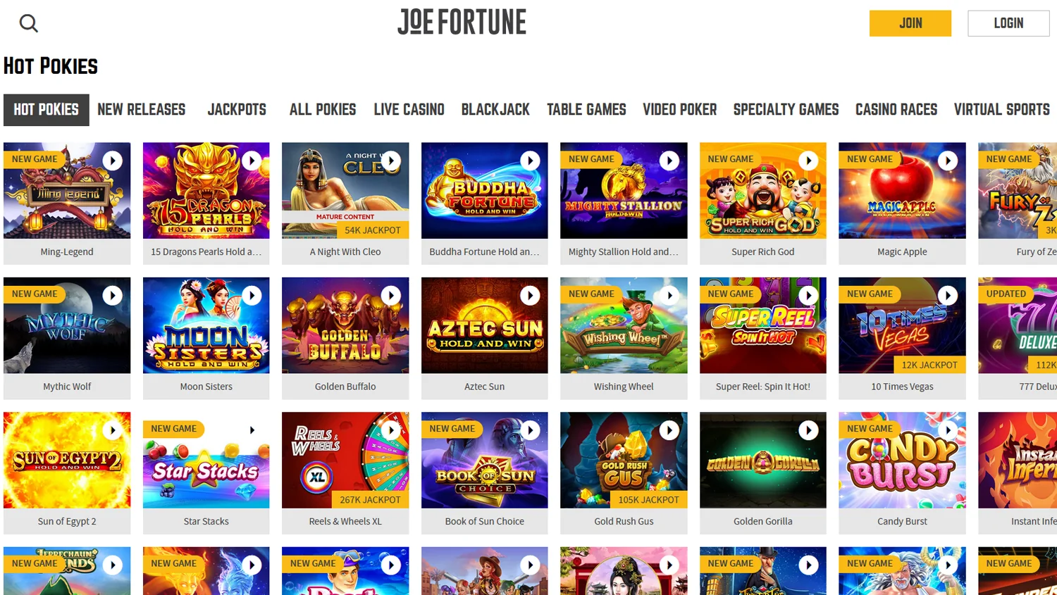Joe Fortune is famous for the wide range of casino games Aussies can find there. The total number of games exceeds 350, featuring the top pokies, table and card games, virtual sports, video poker, and lotteries, as well as live casino software.