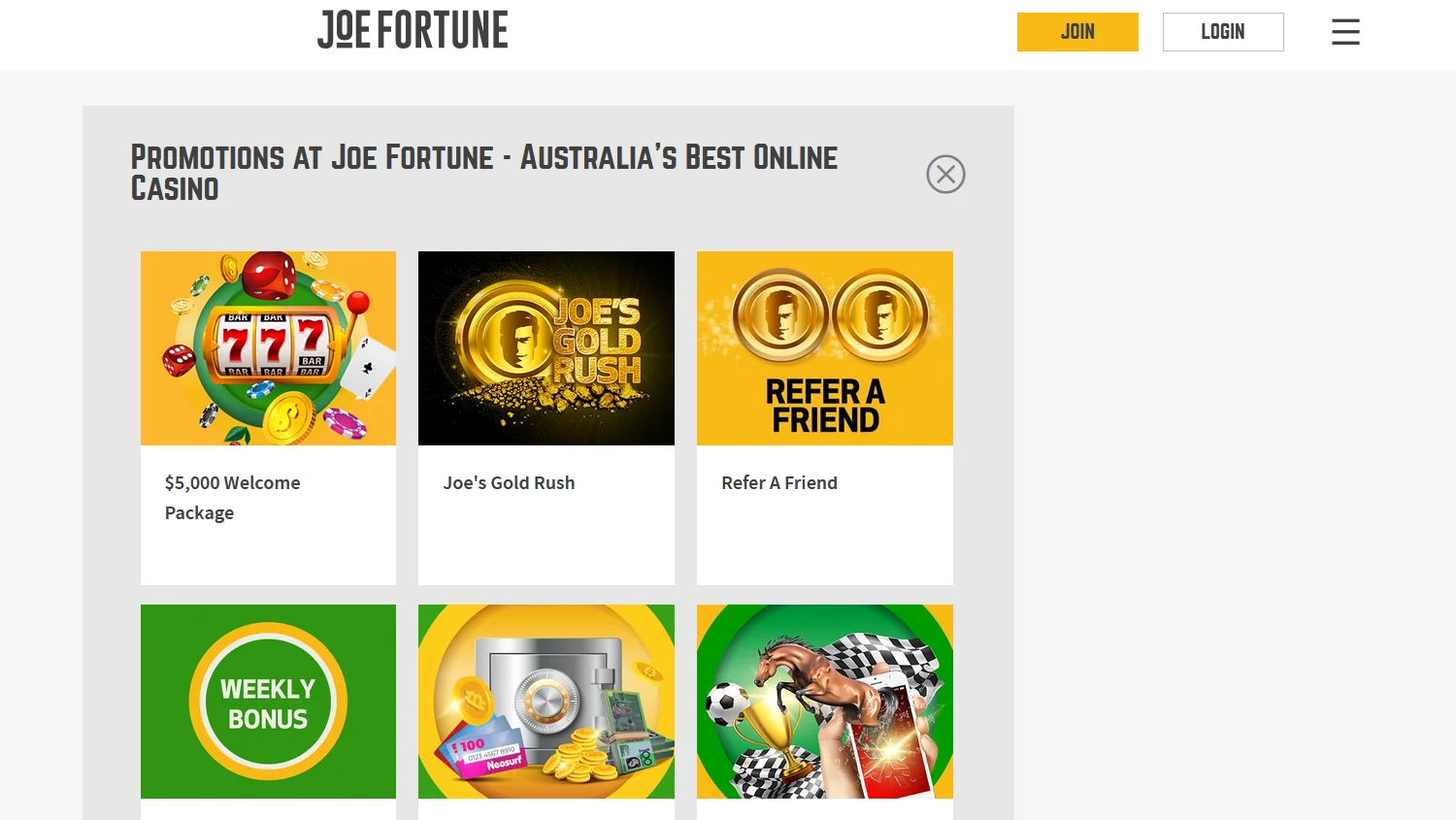 In our opinion, this site meets the needs of modern gamblers and is safe to play. Joe Fortune is a great place to stop by, with a plethora of games and freebies. They welcome all new gamblers with a generous AU $5,000 bonus. Regulars can get even more by picking reload promos or participating in the loyalty program. With a mobile site, you can enjoy the gameplay on the go. Overall, you could say the Joe Fortune platform is certainly worth your attention whether you’re a newcomer or a seasoned gambler.