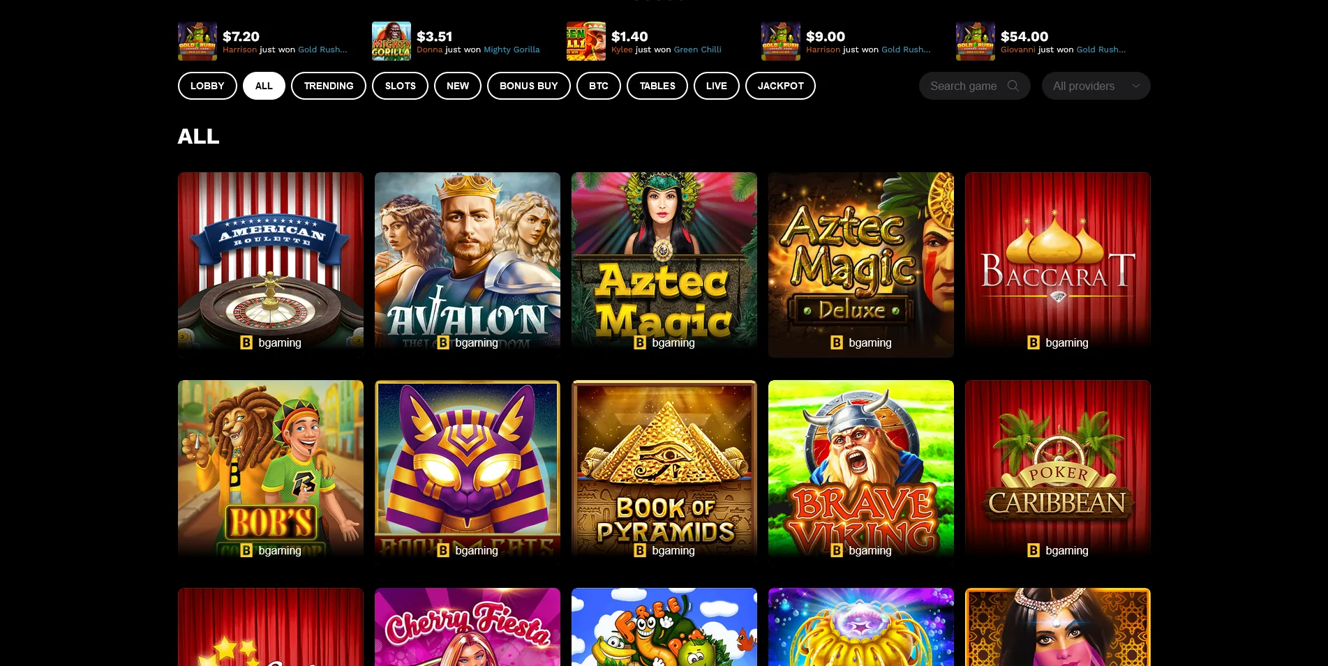 Below the slider, you can see the latest winners of the site. This updates itself constantly. Just underneath is where you can find the gaming categories. You can filter-based BTC, Jackpot, Slot,s or Live games, among others.