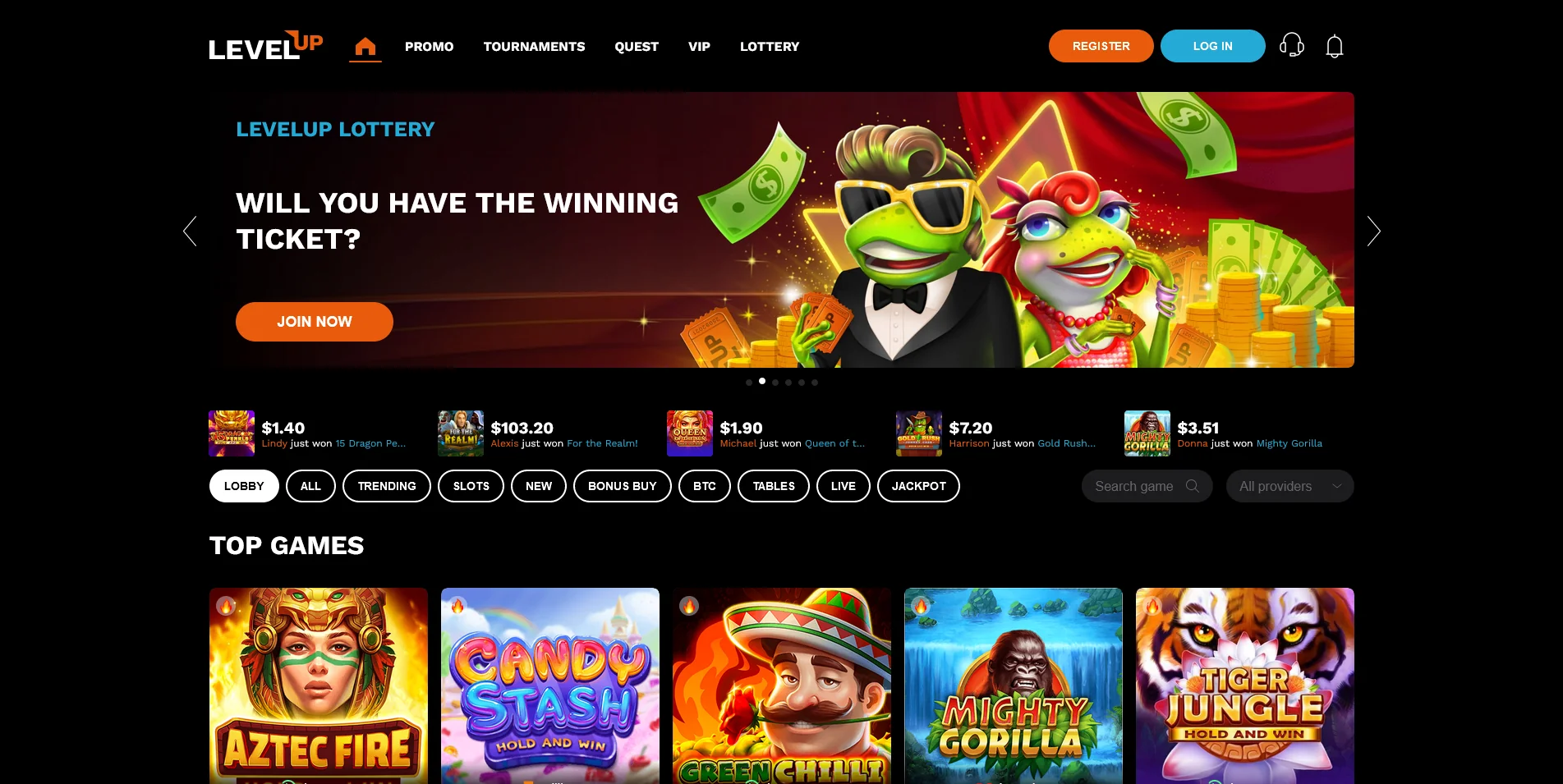 Next to the LevelUp Casino game categories, you can also find the Search Bar as well as the “All Providers” button, where you can filter LevelUp Casino pokies based on the exact name or software provider. Below this feature, you can find a list of the top games.