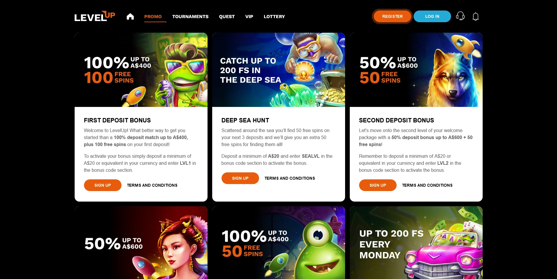 | Welcome Bonus Package | Deposit bonuses up to AUD 2,000 + 250 Free Spins, including 50 Level Up Casino No Deposit Bonus Spins |