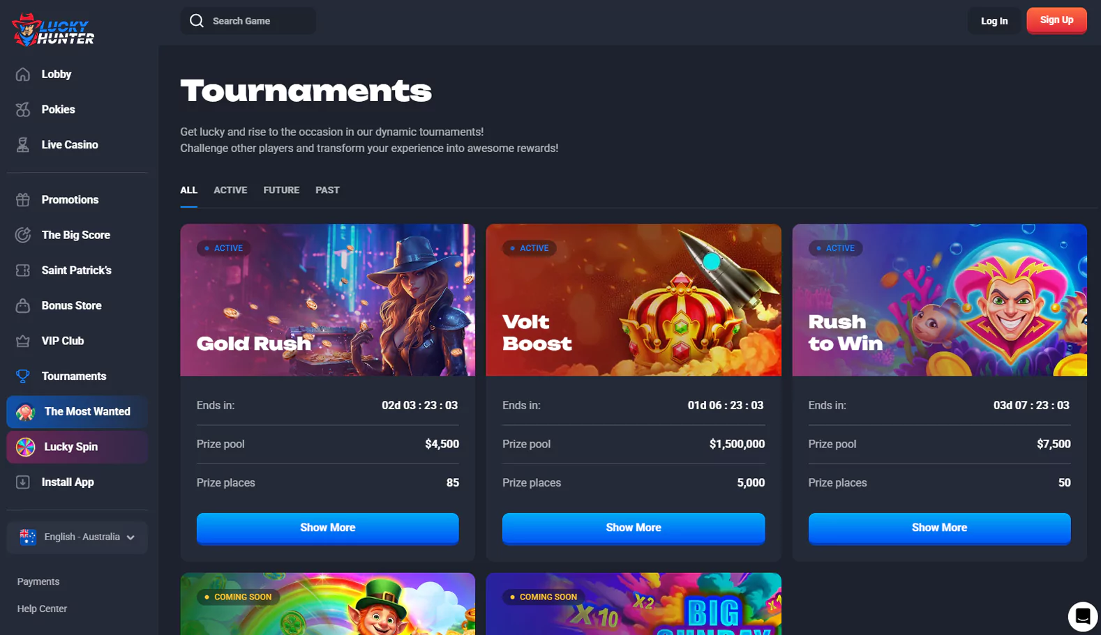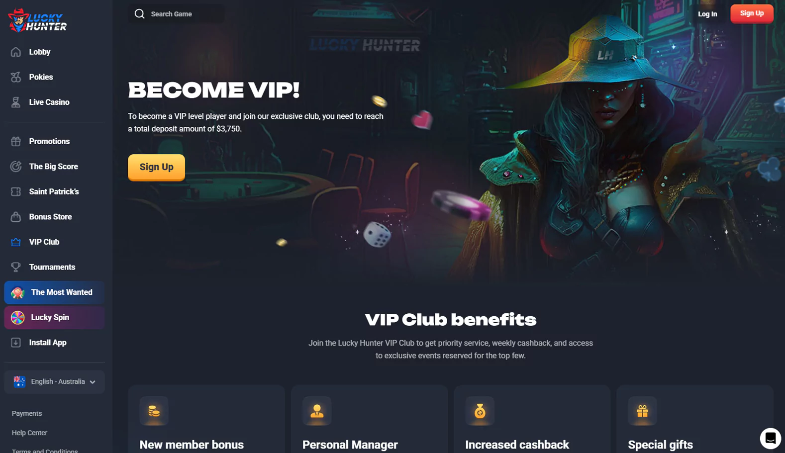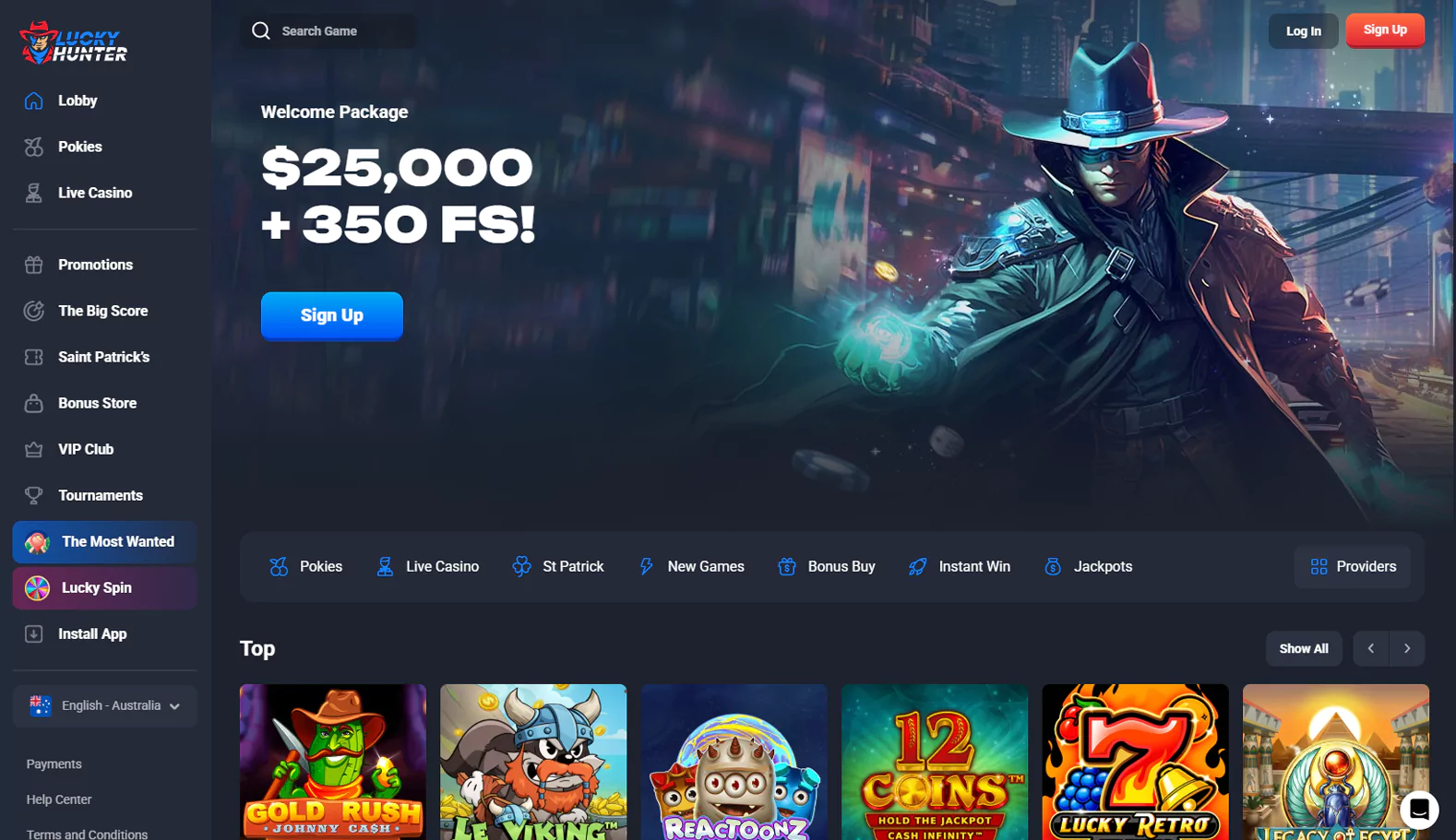 Like the majority of contemporary AU casino sites, Lucky Hunter is designed in dark colors with the predominance of dark gray and blue. With such a choice of main colors, the website does not look too bright and colorful which makes navigation easy and intuitive.