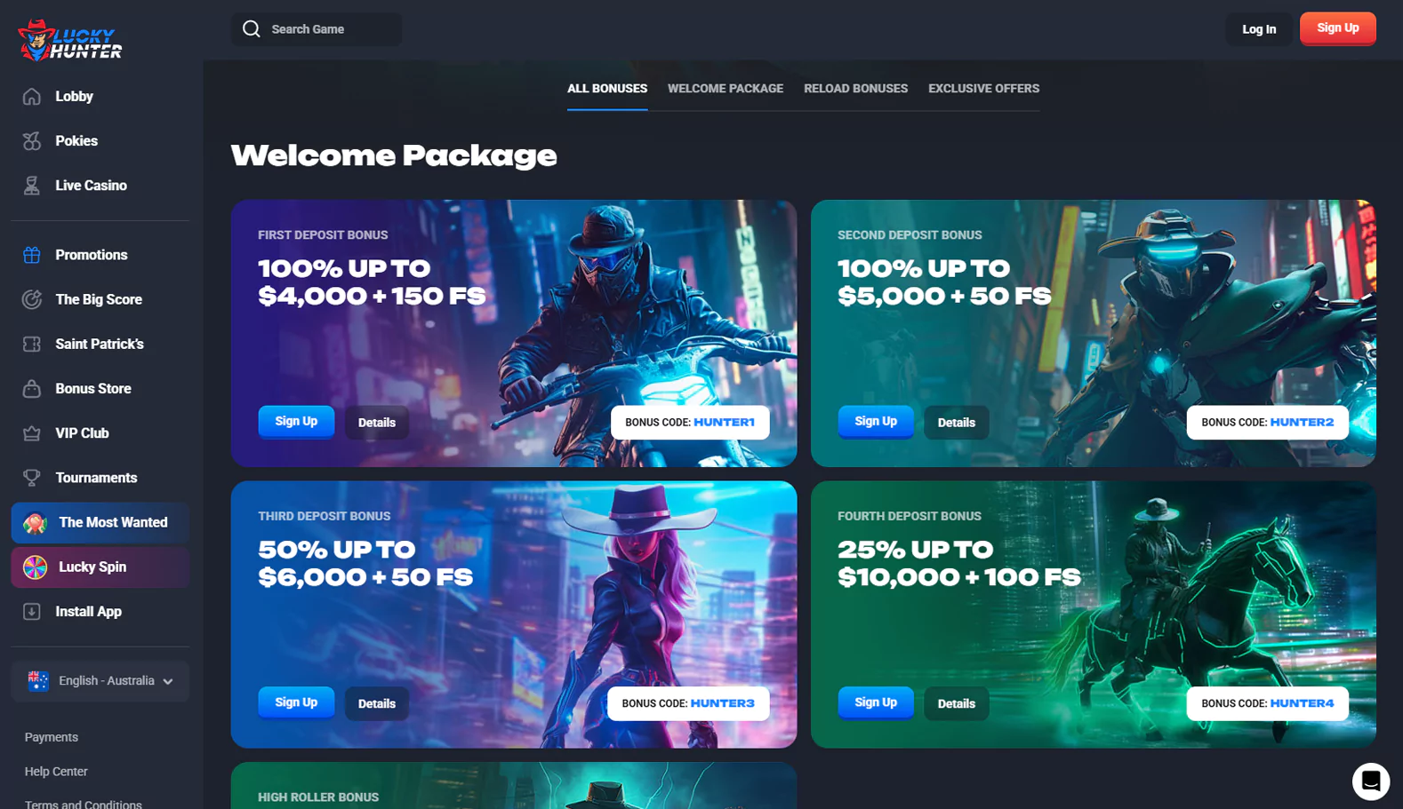 Lucky Hunter is a casino website that has been operating on the territory of Australia for more than 2 years. It continues to attract new players by offering numerous promo incentives, games from prominent software studios, regular tournaments with big prize pools, and so on. Now, this brand has a reputation of a worthwhile casino with over 4,000 games, a mobile app for Android and iOS, and speedy payouts. Look through the following table.