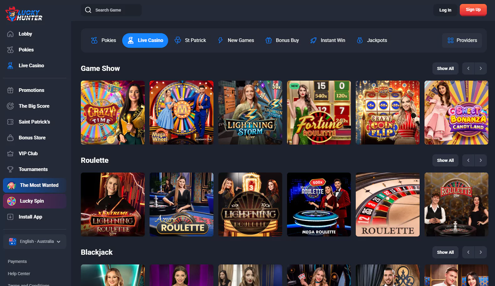 Those Australian users who are keen on playing against real croupiers can choose the live casino category in Lucky Hunter. This section collects over 500 offerings from leading software studios. No matter which game you opt for, you will be provided with professional services from dealers. Furthermore, live titles have lots of features such as chats, jackpots, and so on.