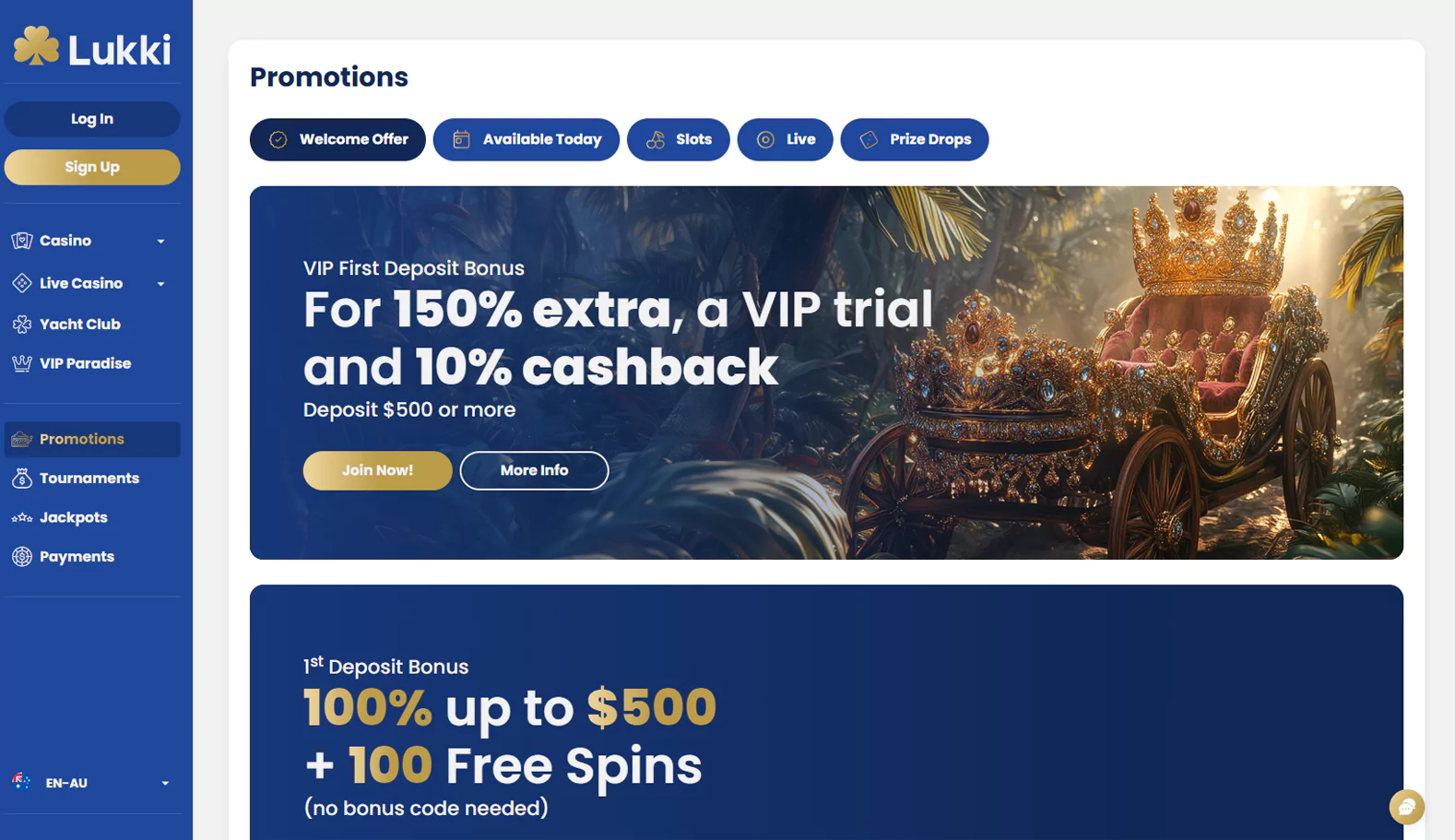 | Friday Frenzy | Enter the “FRENZY” Lukki promo code on Friday to activate this reward, then make a deposit of 30 AUD. You can collect this gift up to 5 times, receiving 50 free spins for each. In total, the maximum you can collect is 250 free spins for pokie machines on the site |