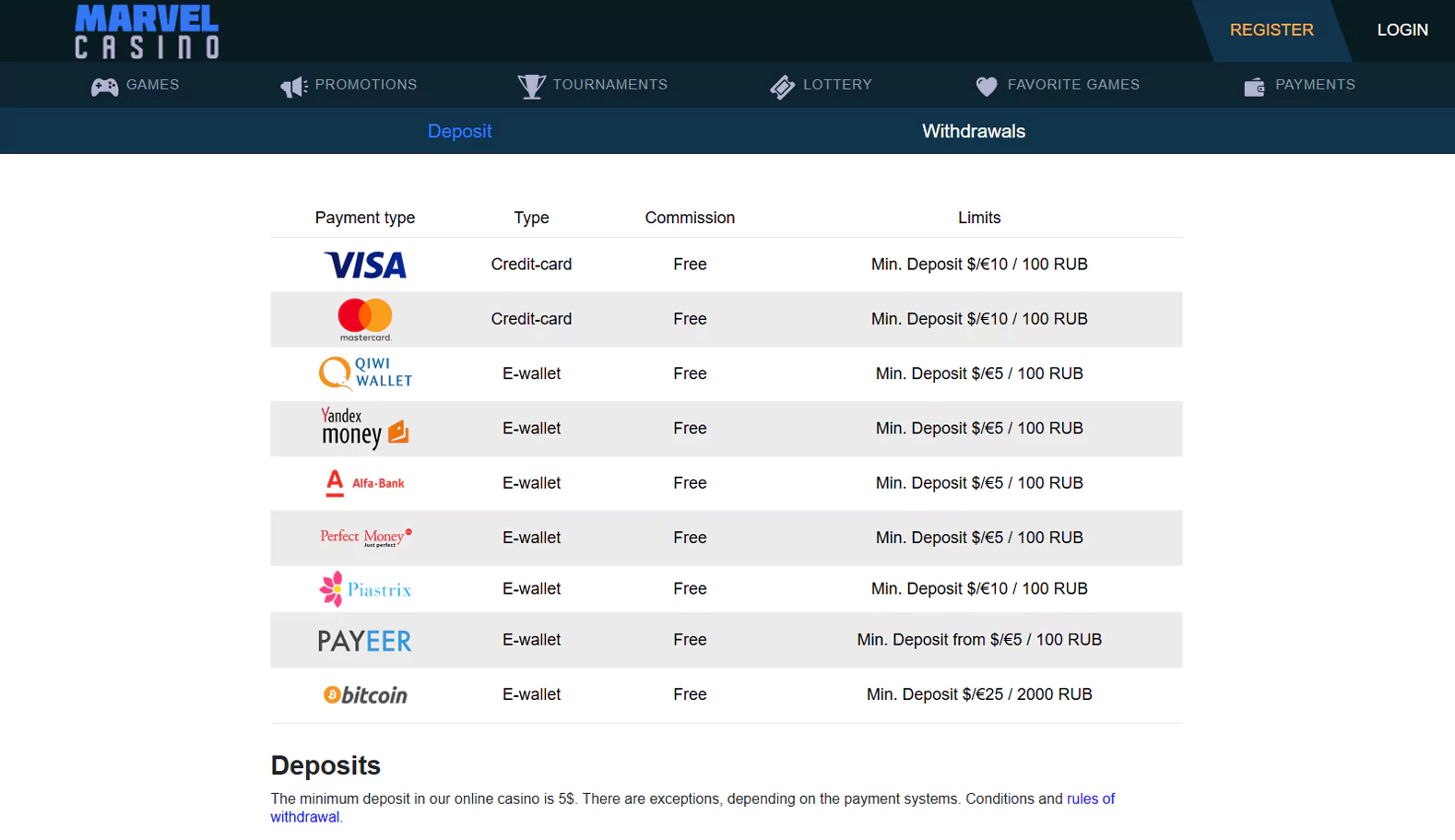 Marvel Casino provides simple, fast, and most importantly safe deposit and withdrawal methods. All this is done so that players can easily conduct all transactions using only verified payment methods. You can find out what they are and what their limits are from the table below: