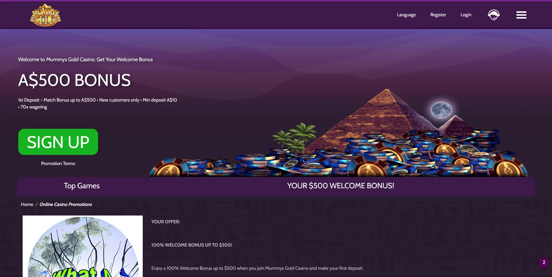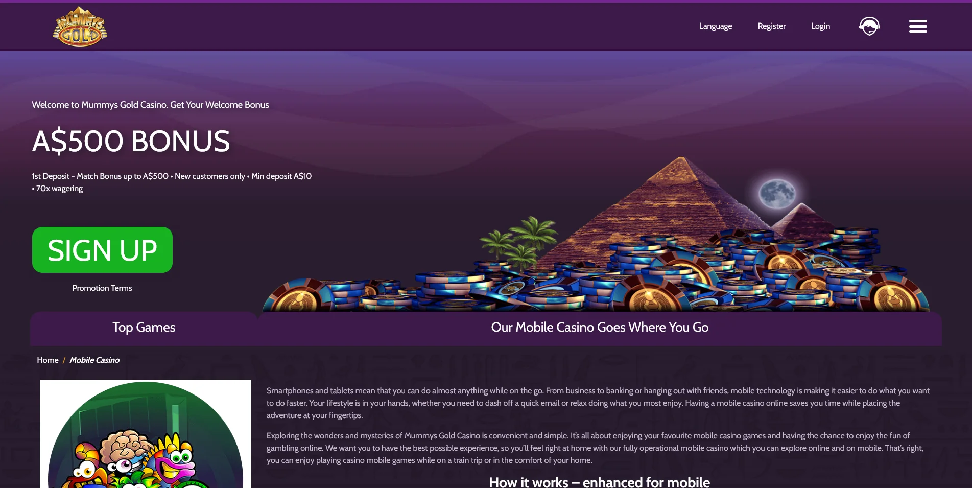 Speaking of the gambling market in Australia, Mummys Gold carries the full legit to operate in this country. It is regularly checked on casino games and their compliance to the RNG factor which predetermines fair play for Aussie players. These, and a huge depository of slots, banking methods, user-friendly layouts helped a provider enlarge the number of Australian users who seek real money gaming.