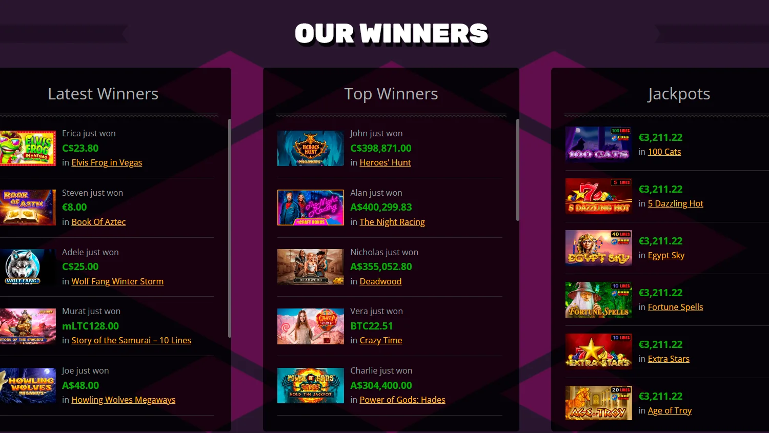 After the FAQs, there’s a list of ‘Our Winners’, and visitors can familiarise themselves with the Latest and Top Winners, as well as current Jackpots.
