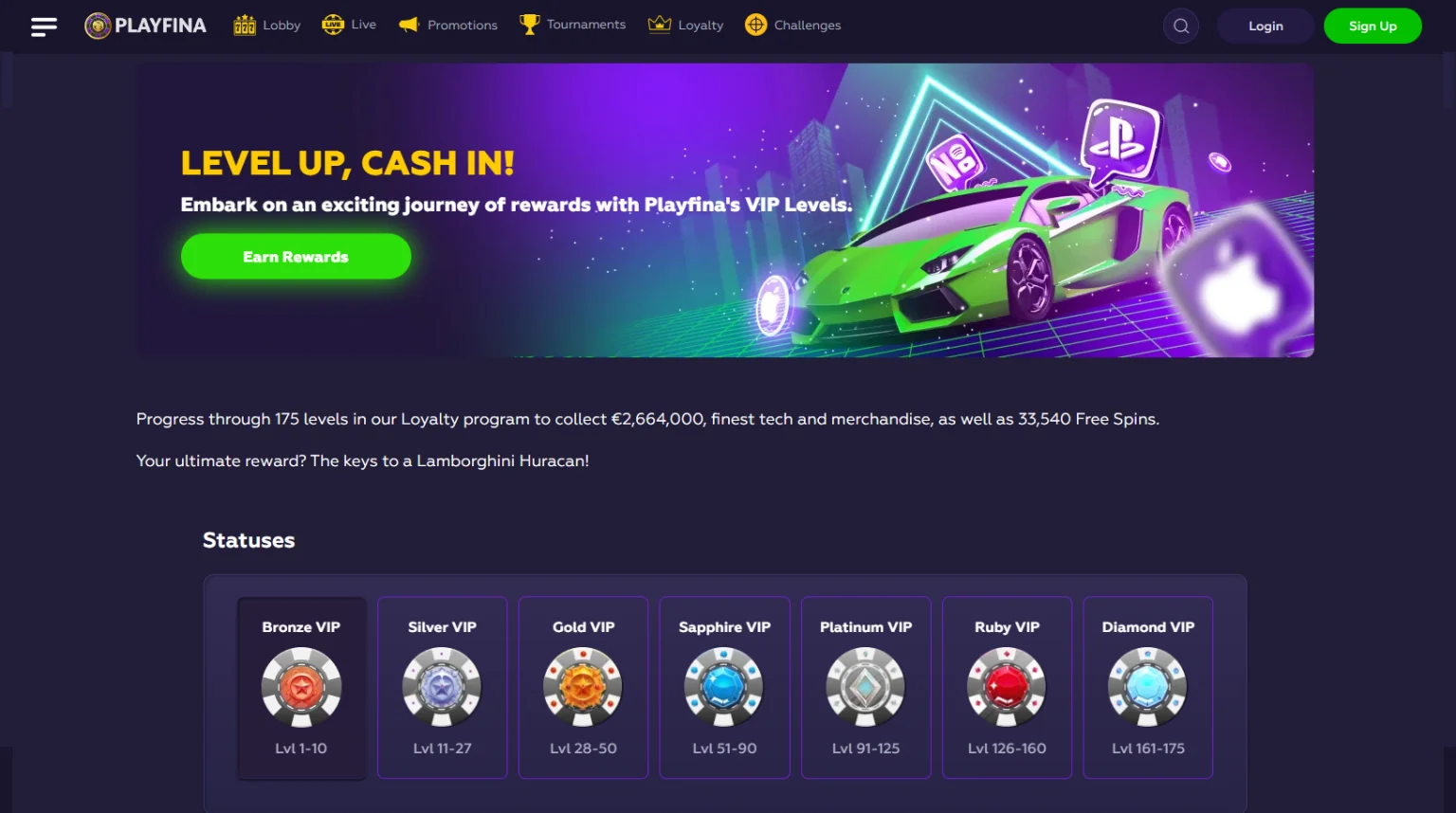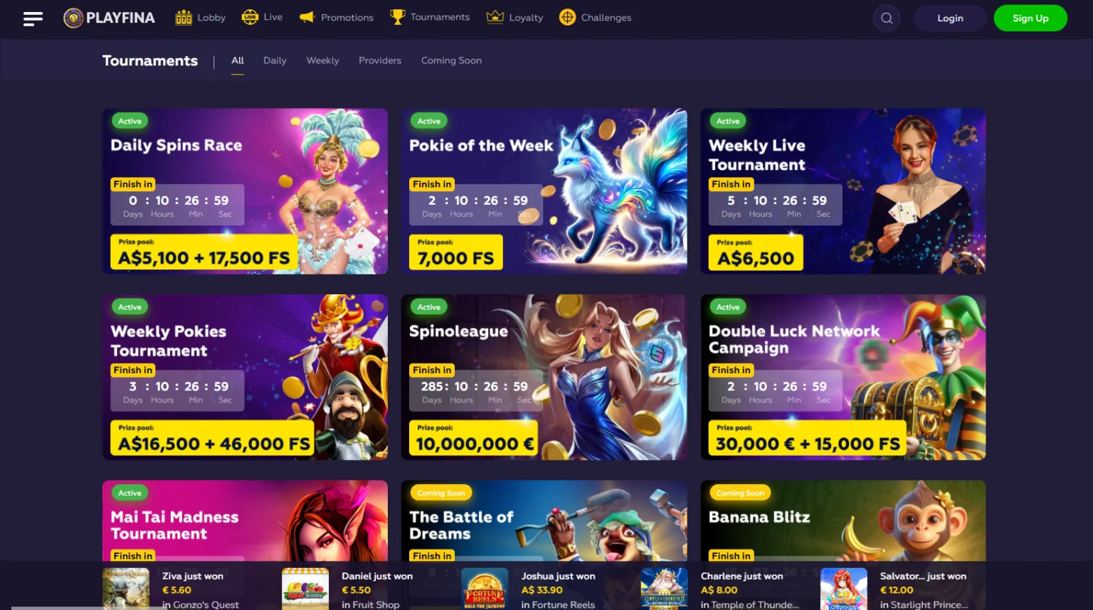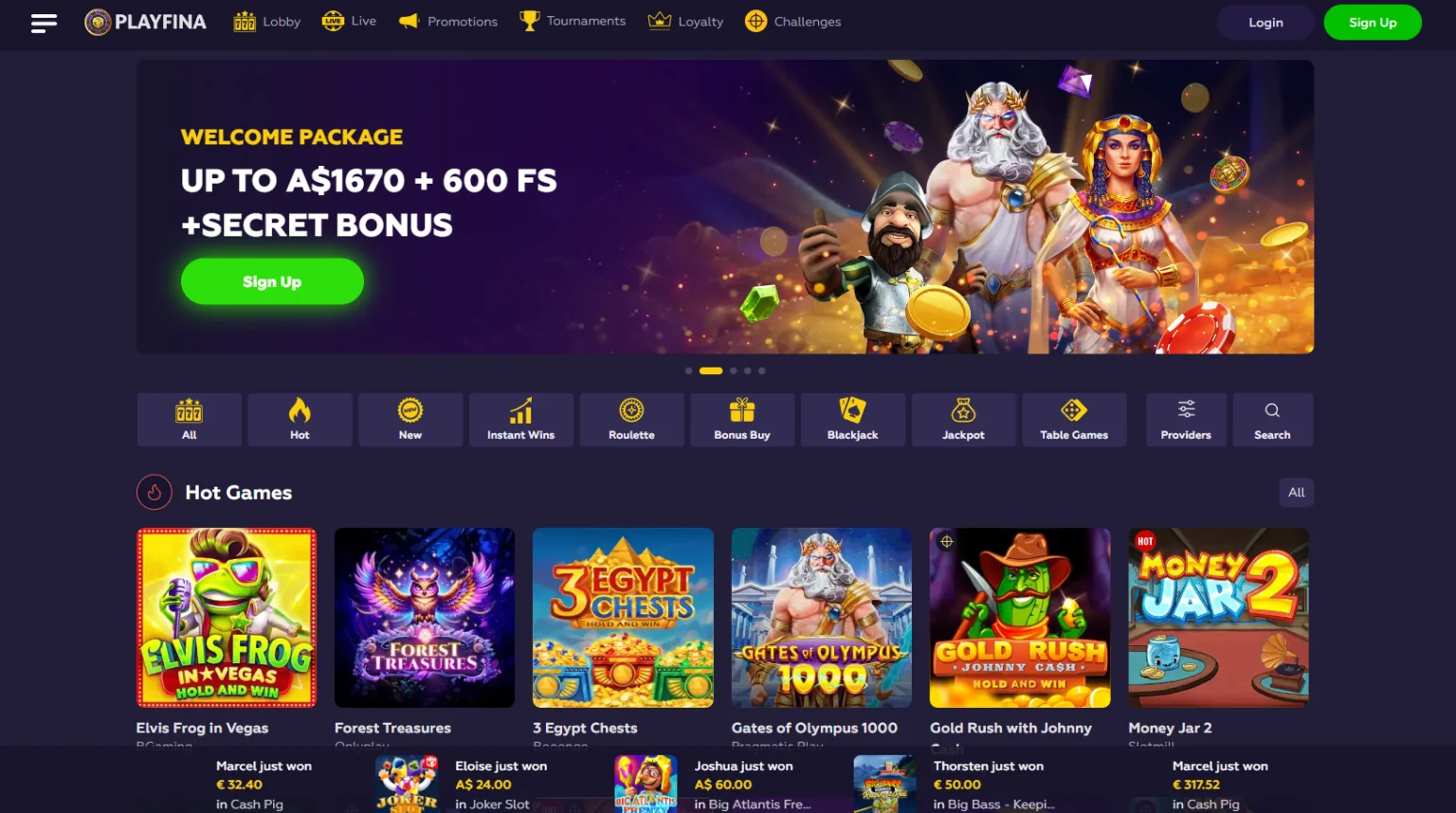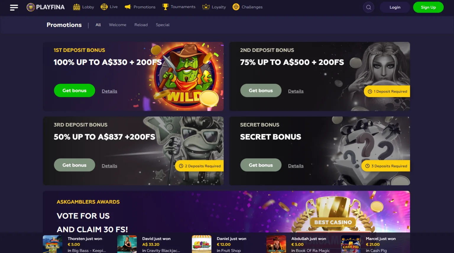 - Promotions. On this page, users can find information about all current Playfina casino bonuses and promotions;