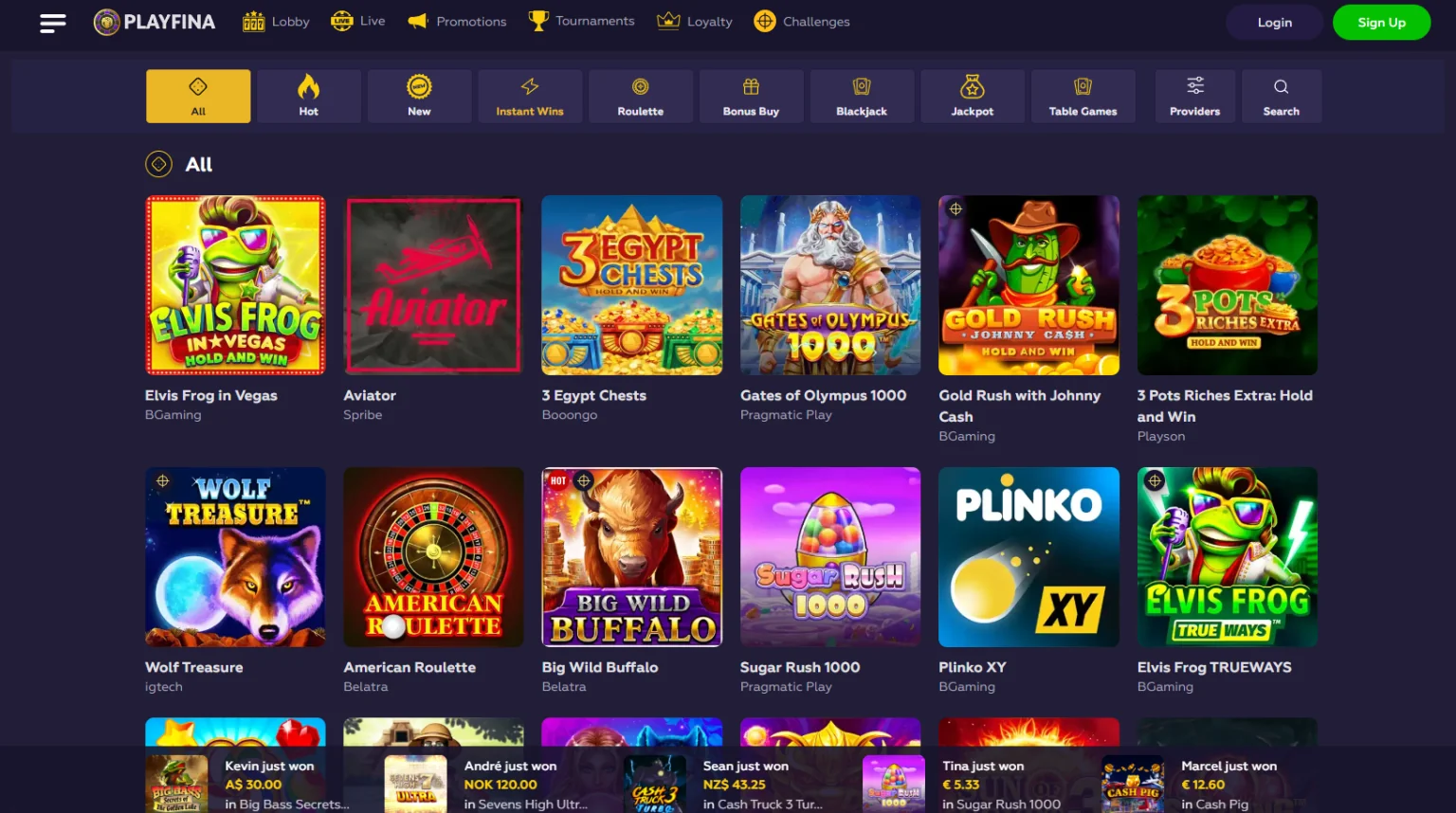 Playfina casino for Aussies currently features more than 11,000 games in various genres: pokies, crash games, instant games, jackpots, table games, live games, and more.