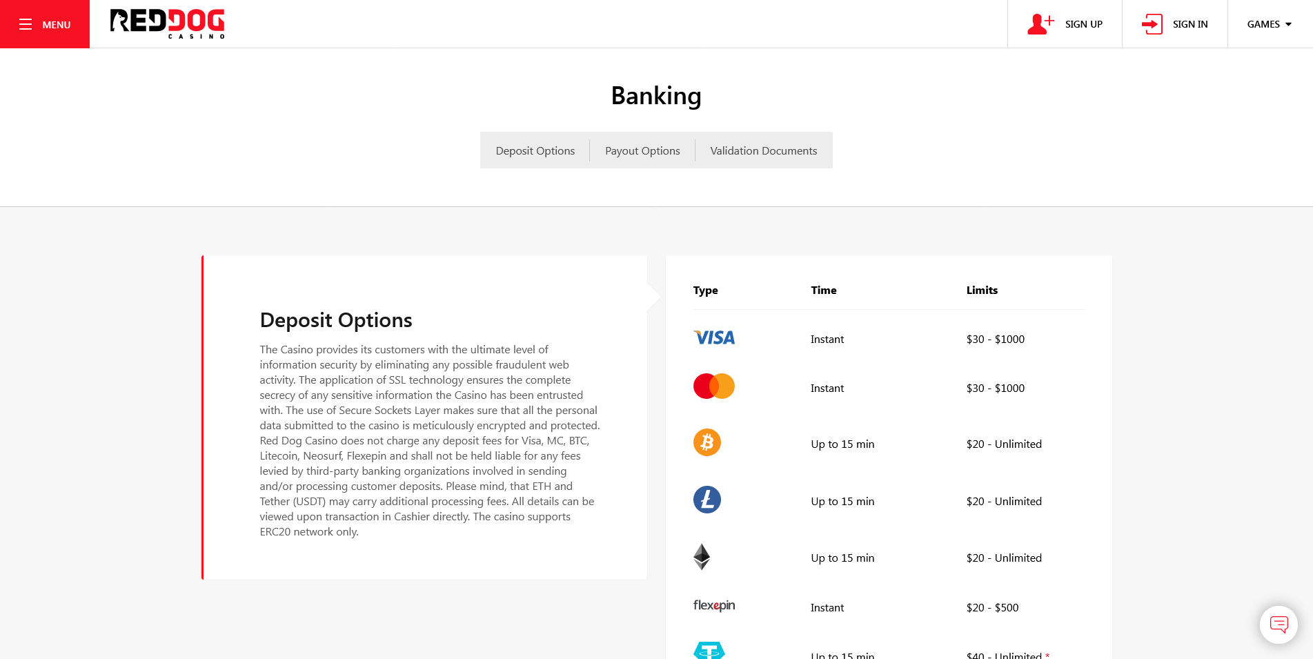 So, here is a table with all the information regarding depositing funds to a RedDog Casino account: