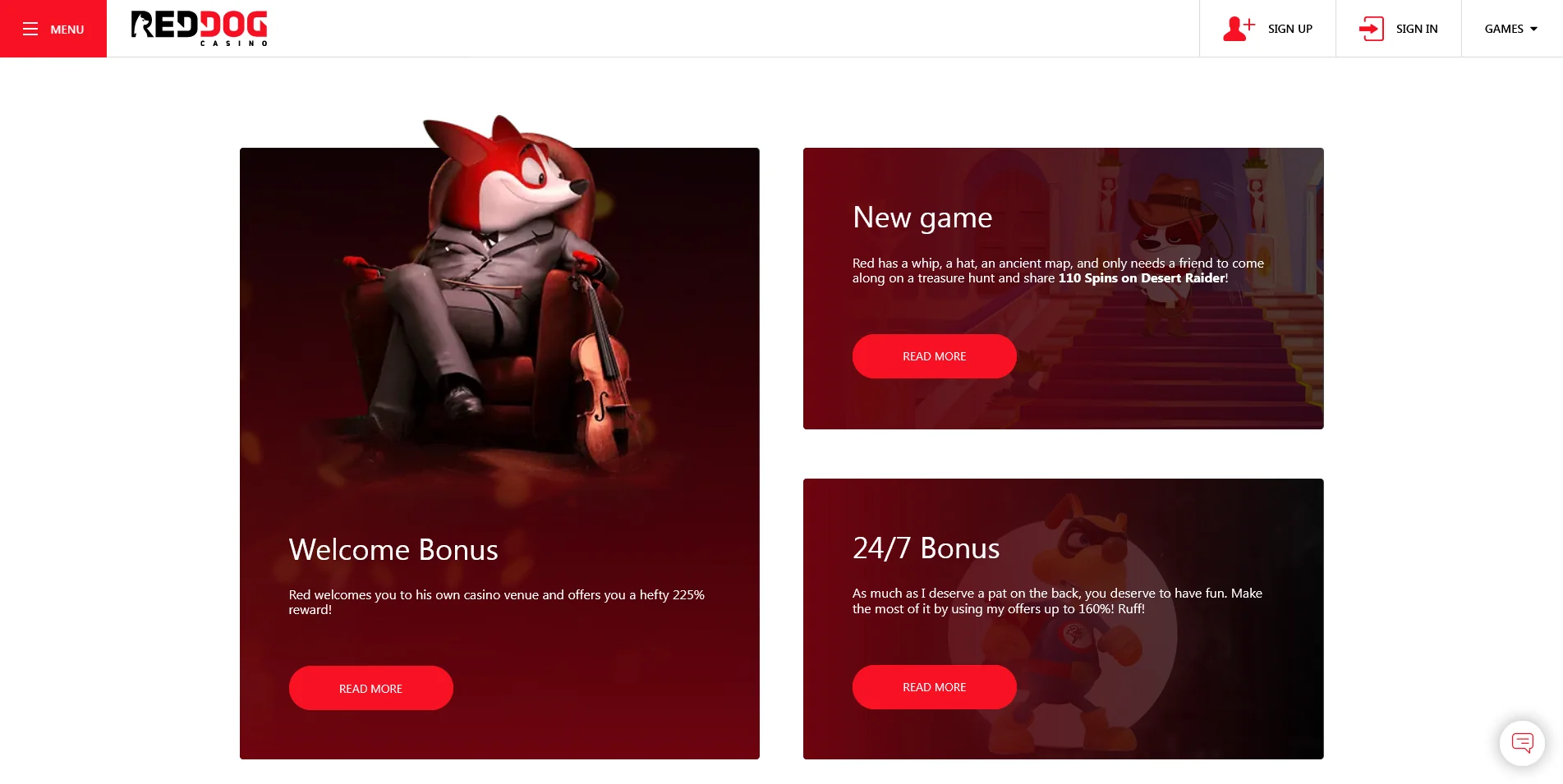 The RedDog Casino website welcomes newbies with a simple yet elegant design in pretty colors. The color palette consists mainly of white, red, and gray colors that do not irritate with their colorfulness. The casino conveys information to the Aussies through the main character, which is a Red Dog (which is clear from the name of the casino). All the time that you are on this page, at the bottom right there will be a white and red button calling a support agent who will answer you at any time of the day or night.