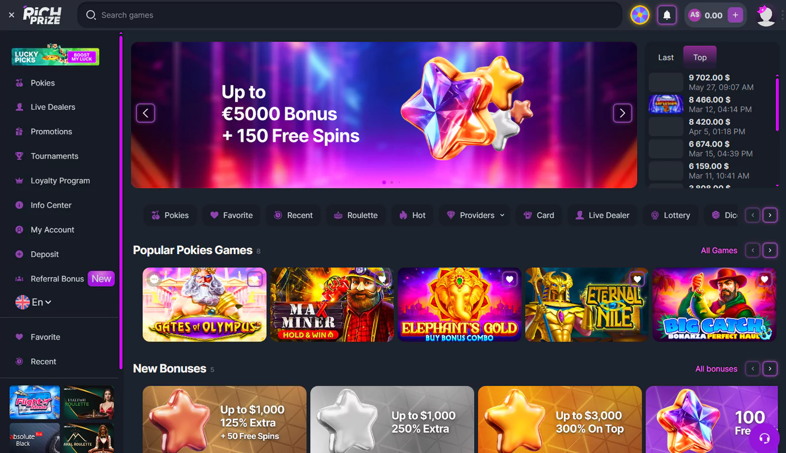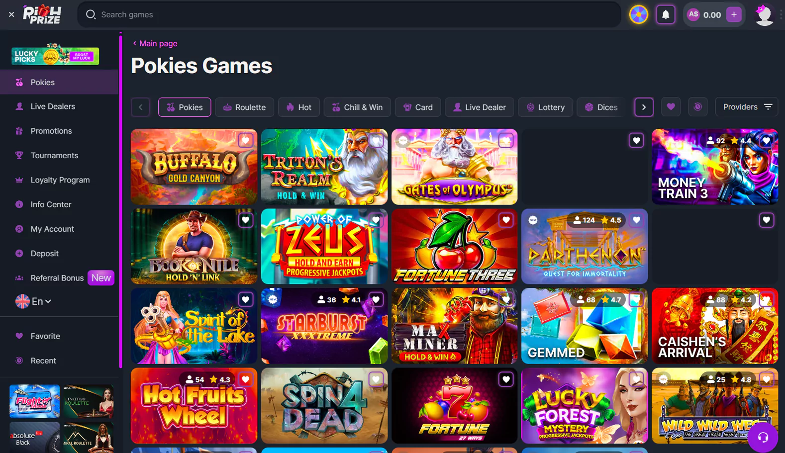 Rich Prize casino has different categories of games. We have checked all of them, from pokies and card games to lotteries and crash games. Each of them allows diving into a completely different vision of gambling. This way every player from Australia can find something that suits his playing style.