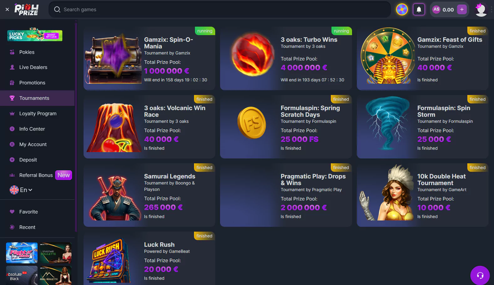 - The left panel of the site – It is used to navigate through the services provided by Rich Prize. Here users can find all categories of gambling, information about bonuses, and tournaments, and learn about the loyalty program;