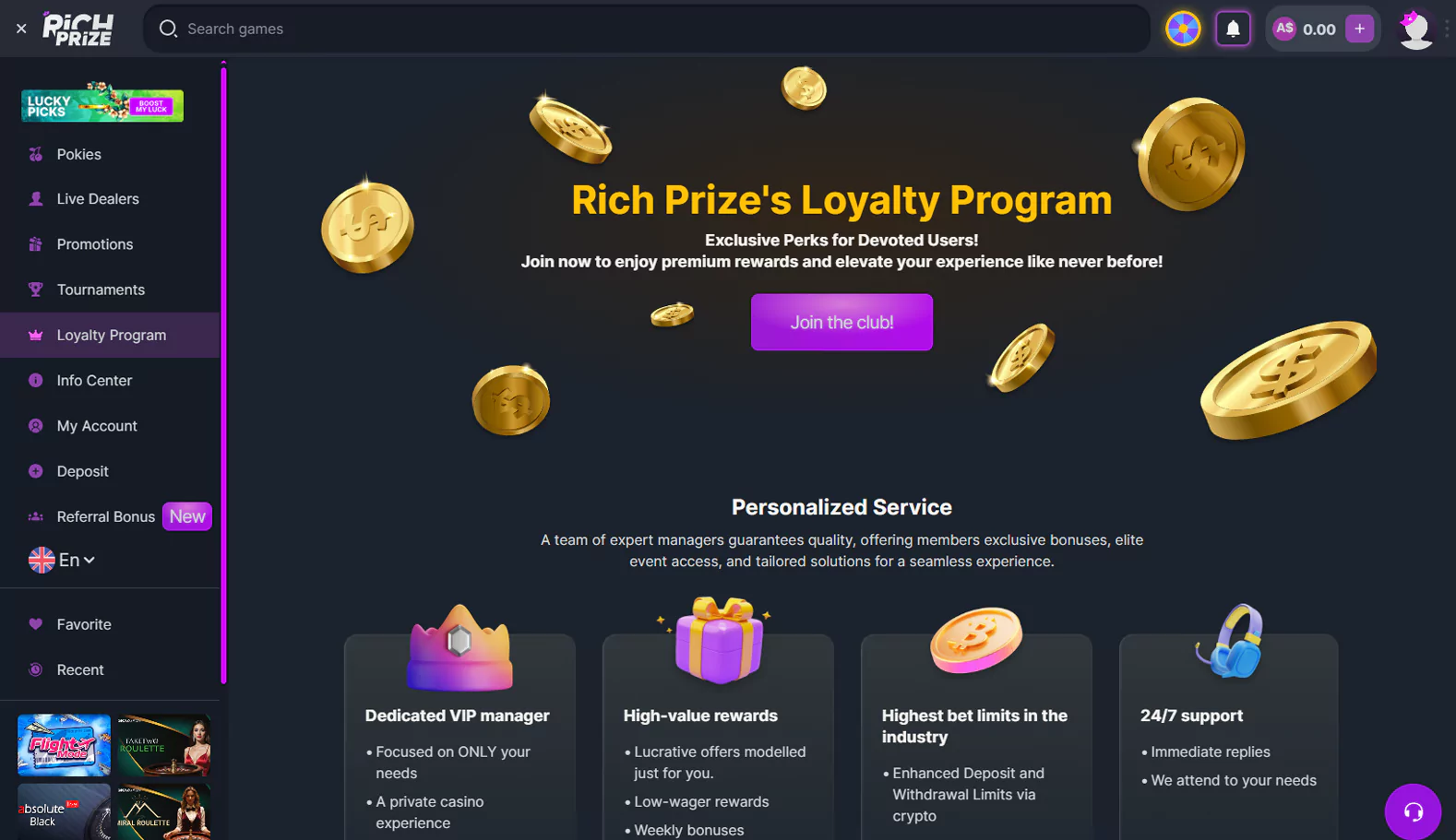 Rich Prize has been operating since 2020 and has been operating in Australia since then without any problems. The owner and management company is Fresharvest N.V. They also claim to hold a Curacao license. The site has an SSL 256-bit security protocol, which is an ace certificate protecting user data. On the website and mobile application, it is possible to study information about responsible gaming, where it is stated that players can ask to set limits for themselves with the help of an agent in live chat.
