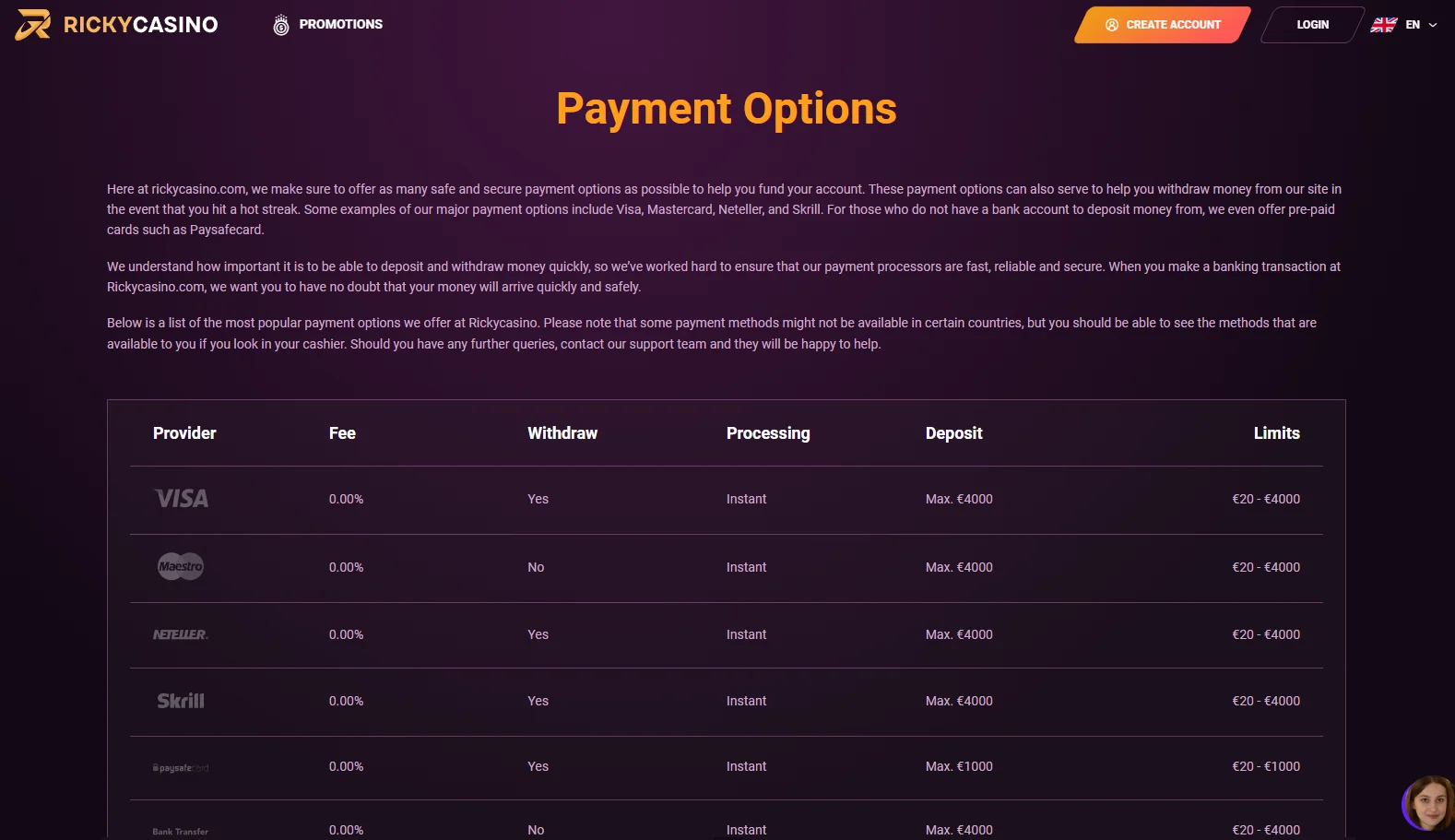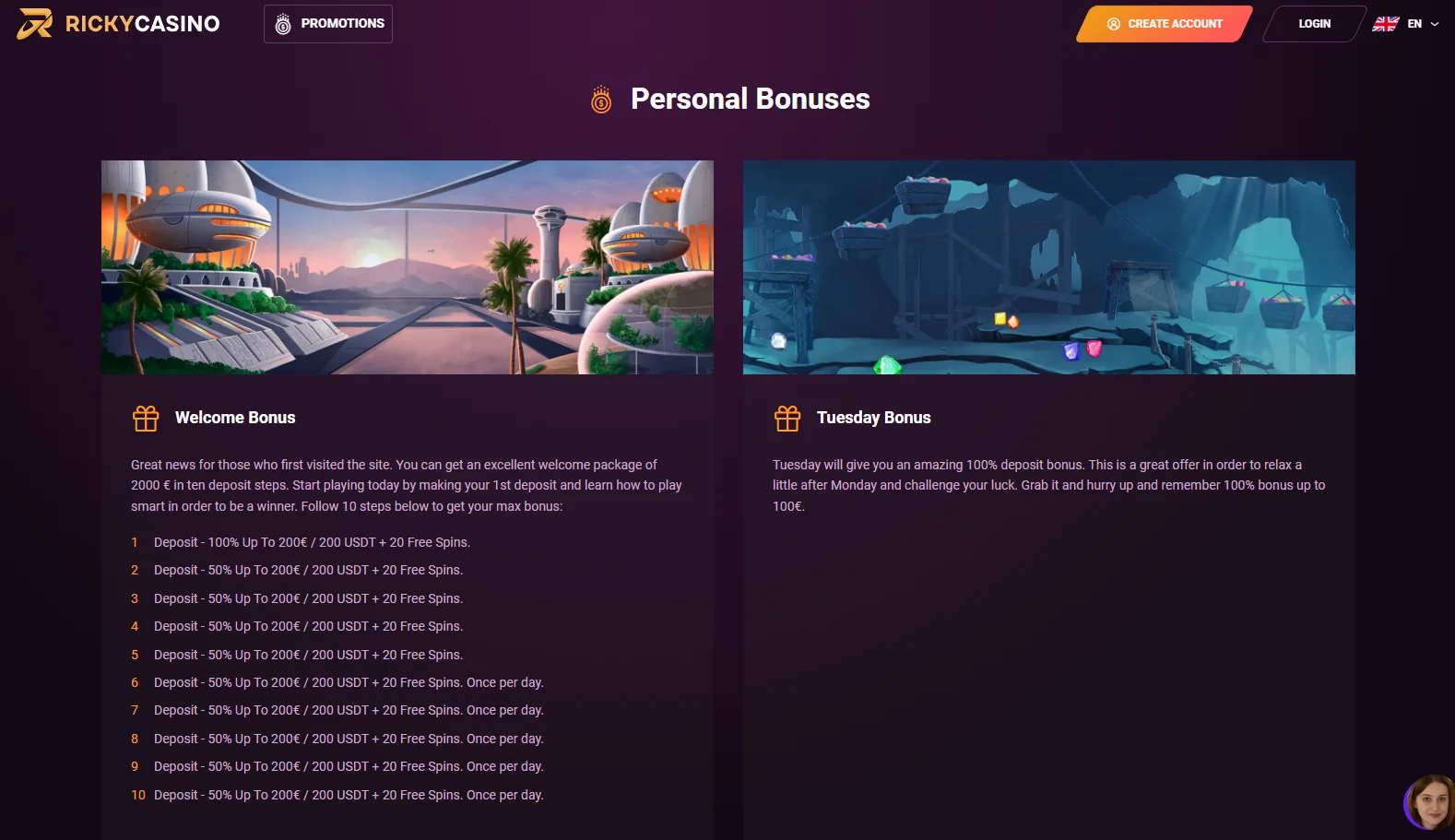 - Doesn’t offer a Ricky Casino no deposit bonus;
