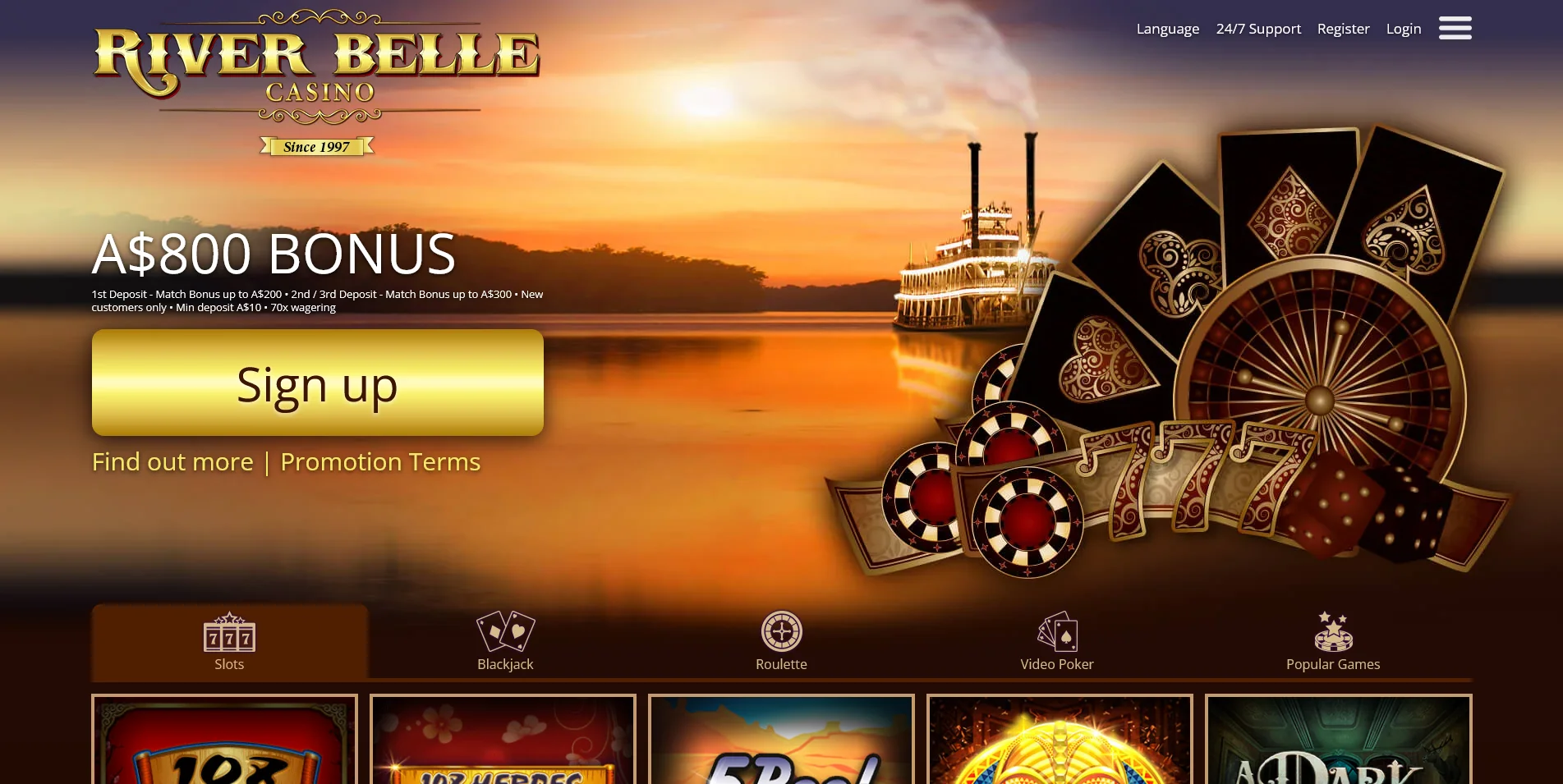 We are pleased to welcome you to our website online-casinoAU.com. River Belle Casino can boast of 20+ years of experience and many loyal gamblers. The licensed website offers gambling entertainment with over 450 real money casino games that range in themes and categories. Both pokies fans and live dealer games aficionados will discover something to their taste.