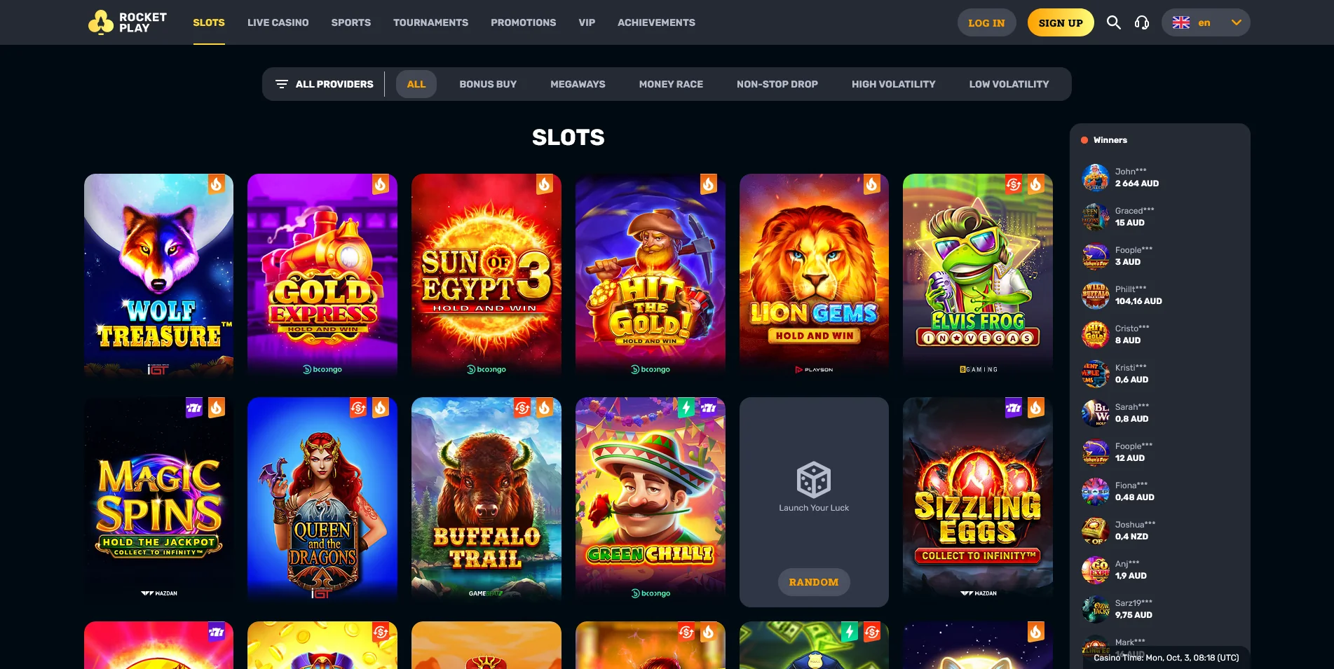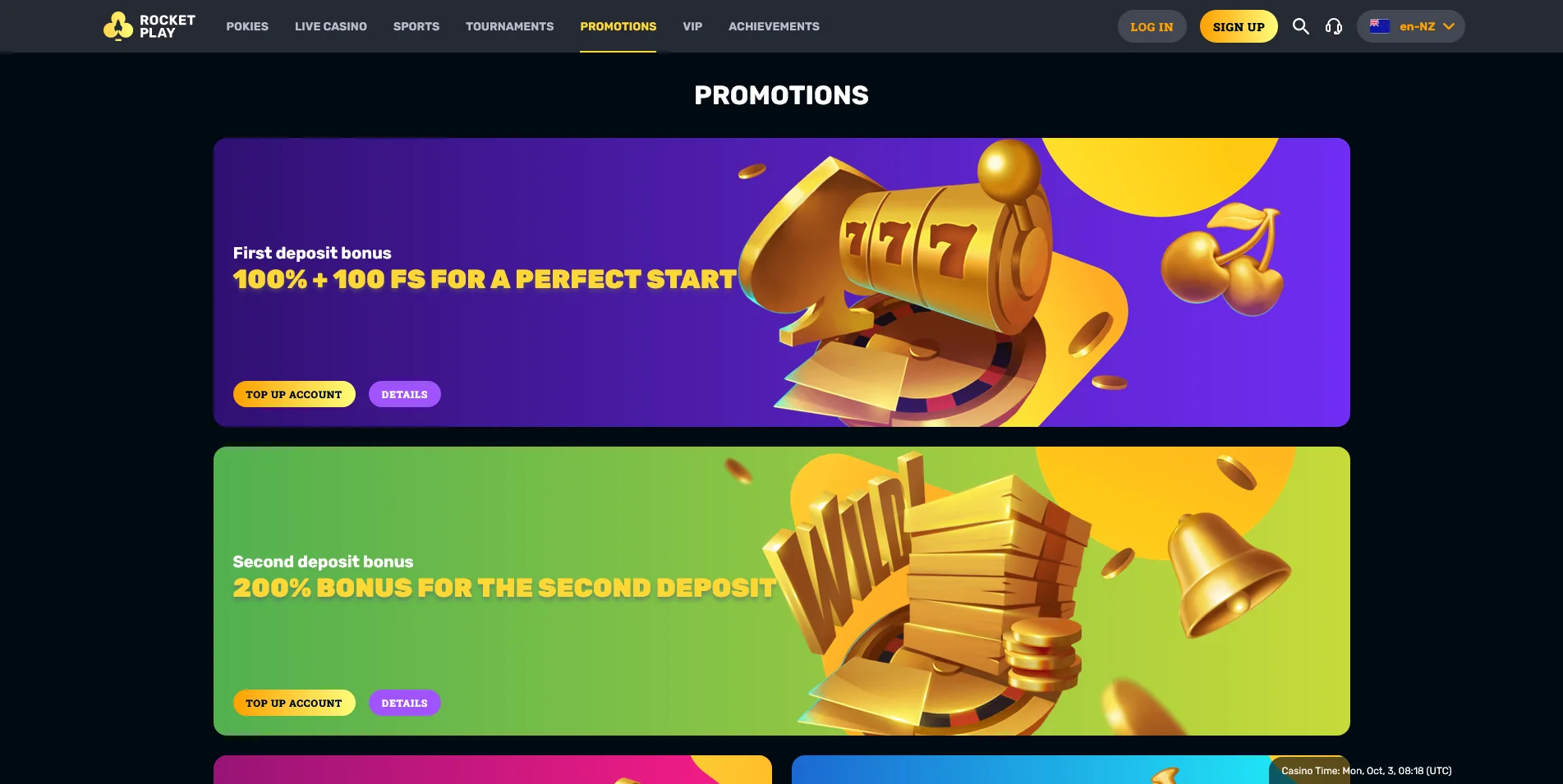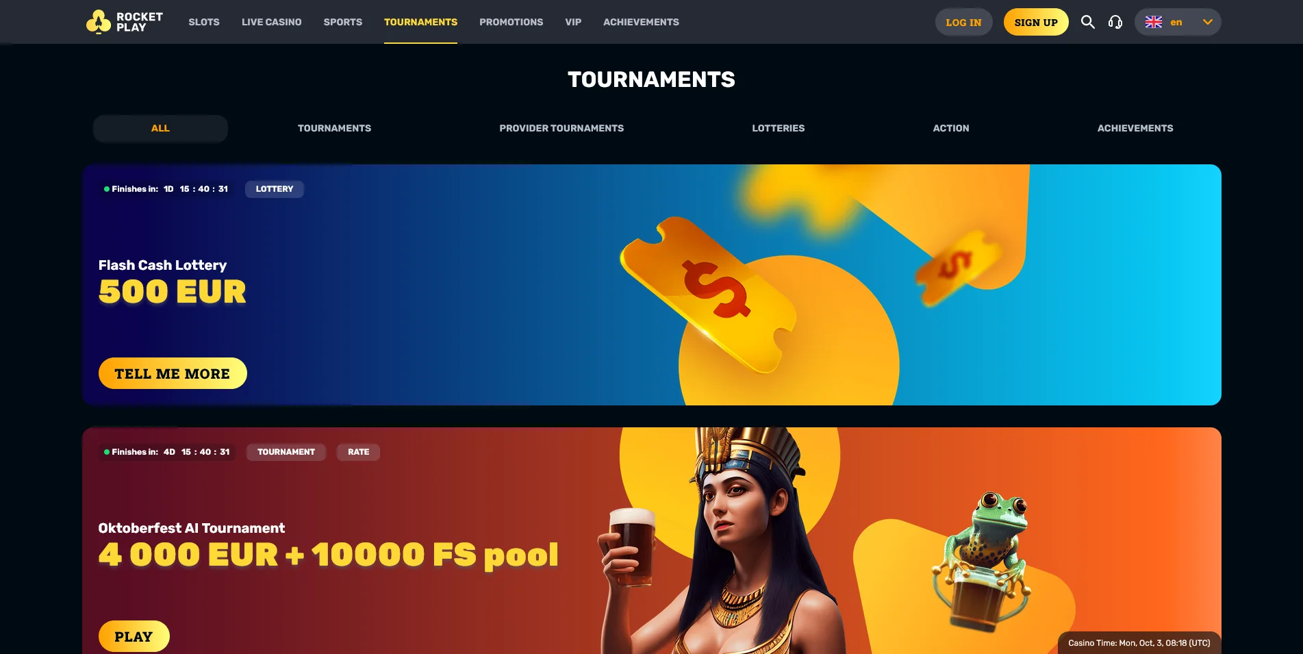 Upon entering Rocket Play Casino, we can immediately see the black, yellow and purple colors of the site. On the main page, we can see the most important promotions highlighted. In addition, we can also access the majority of the site via the top menu bar, which consists of the following navigation buttons:
