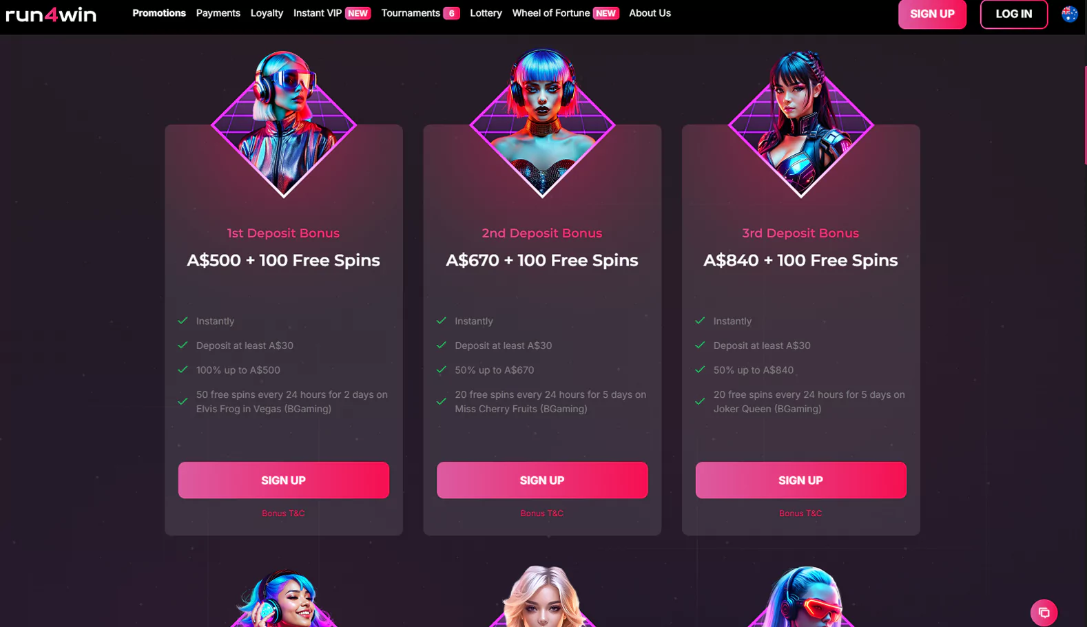 | 3rd Deposit Bonus | Get 50% up to A$840 and 100 Free Spins. The minimum deposit is A$30. Spins can be used in the Joker Queen slot. |