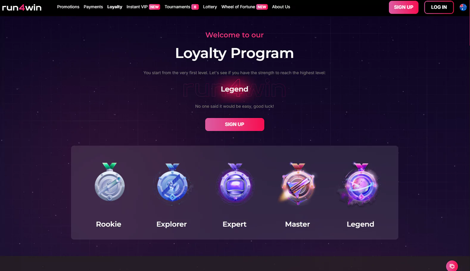 Run4win Casino offers a tiered loyalty program that rewards players for their activity. Players start at the base level and can move up by earning Points (Points) for wagers. Each level provides unique rewards including free spins, cash bonuses and cashback. We’ve reviewed the terms and conditions and compiled the key details in a table:
