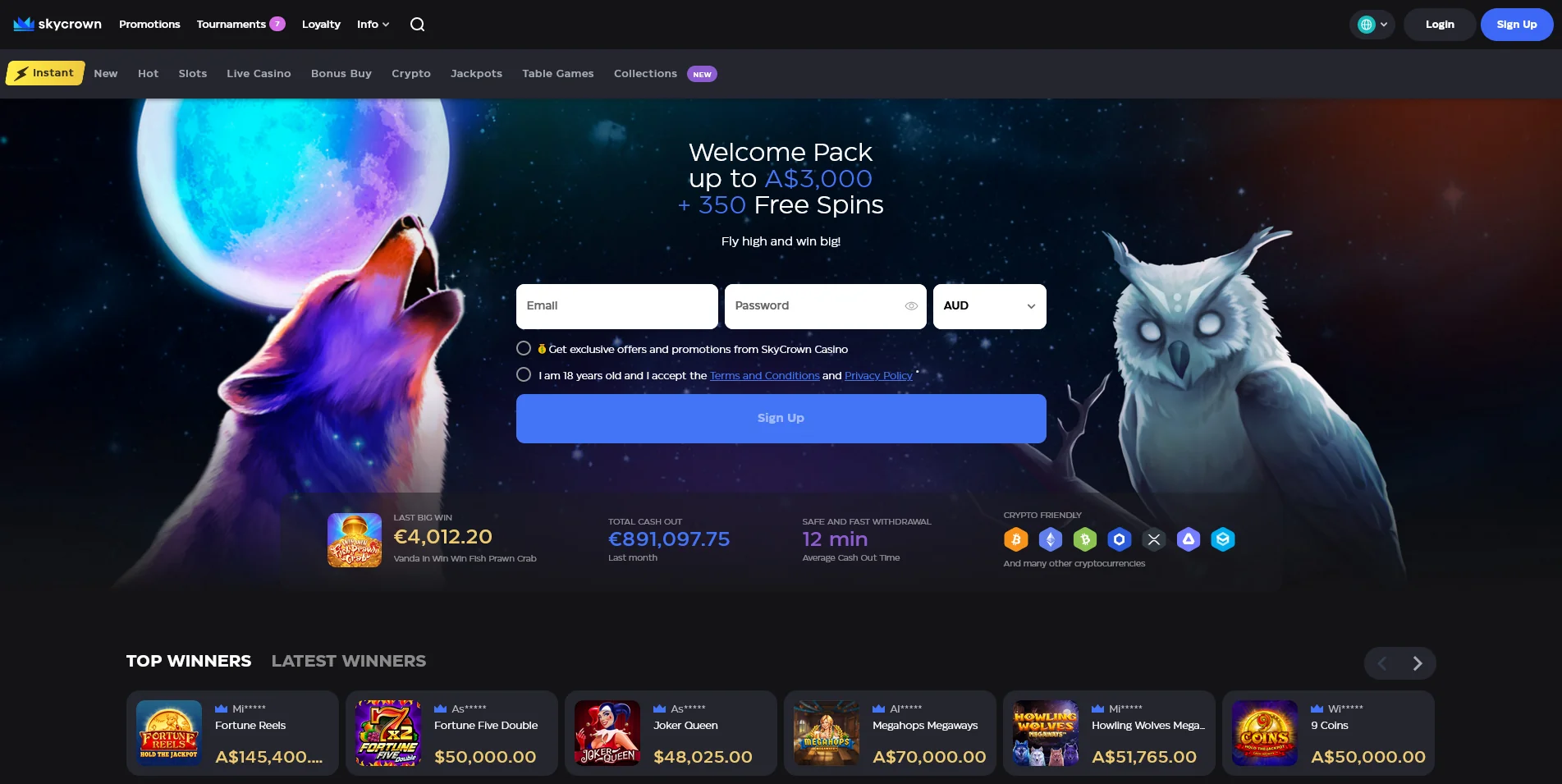 Moreover, players from Australia have a shortcut to the registration process, with the option to enter their details and click on the indigo ‘Sign Up’ button included in the banner. Other info points presented here are the last big win at the casino, the total amount of money that was withdrawn in the casino and the average processing time, and the cryptocurrencies available at Skycrown Casino.