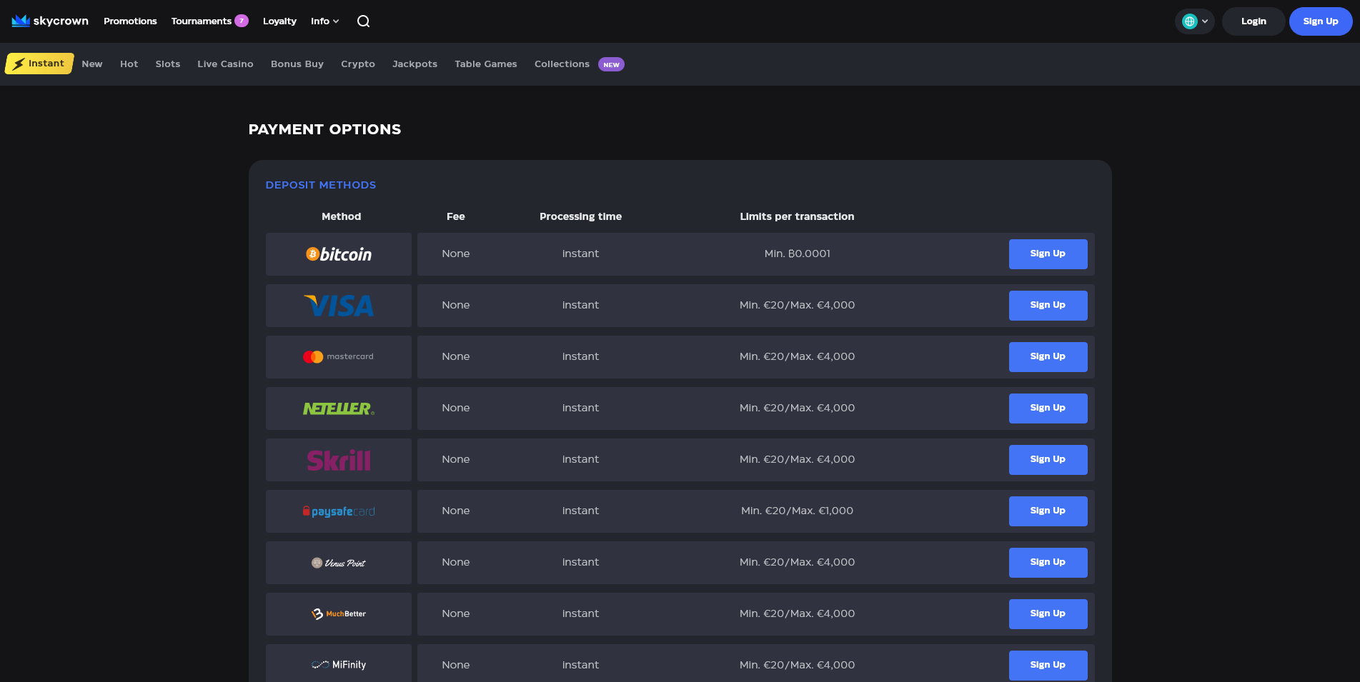In the table below, we share extensive knowledge of each deposit and withdrawal method at Skycrown Casino, its caps, and processing time.