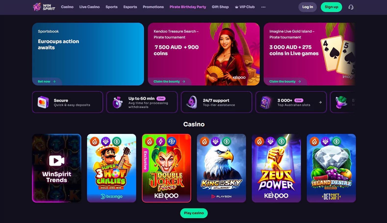 WinSpirit casino website is a great place for gambling in Australia in 2025. Here you will find everything you need to play pokies: reliable protection of personal and payment data, professional support, convenient transaction tools, as well as bottler bonuses, and ripper casino library.