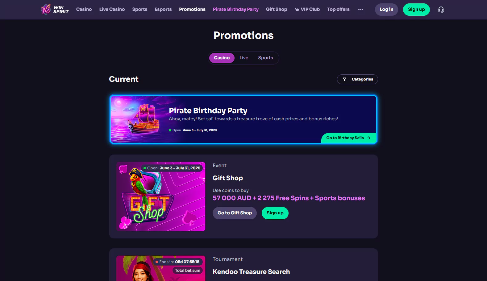 Australian players can expect a variety of gifts and rewards at this gambling website, including WinSpirit free spins no deposit Australia, welcome offer, tournaments, cashback, and regular reload gifts. We have outlined all the main bonuses for you.